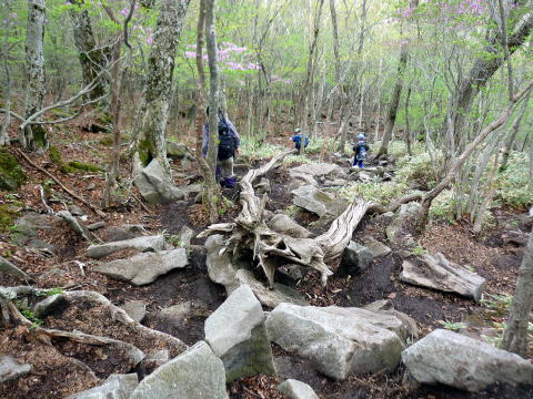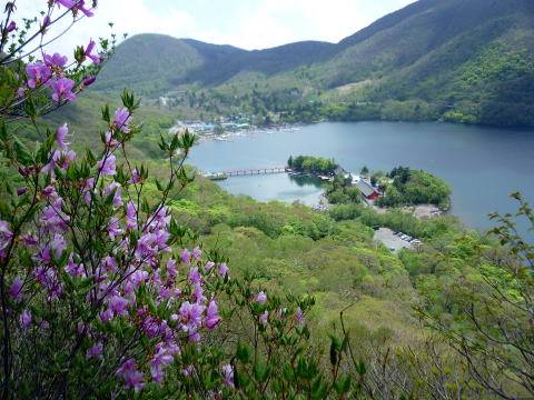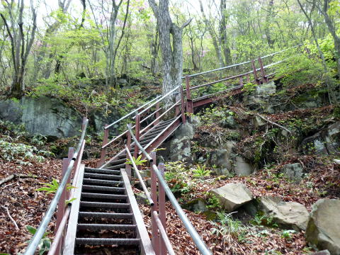 大洞P 10:20〜11:00 駒ヶ岳 11:05〜11:40 黒檜山 11:50〜12:35黒檜山登山口〜 12:50 大洞P 10:20 大洞P出発。(トイレ&自販機あり) 車道を少し歩き、駒ヶ岳登山口へ。 黒檜山登山口から登り、こちらへ下山しようと思ったが、登山口前で団体さんがストレッチを していたので混雑を避け、こちら側から登る。 緑が目に鮮やかな道は気持ちがいい♪ 所々にムラサキヤシオの濃いピンクの花が混ざり、アクセントになっている。 振り返れば、樹間越しに大沼も望め、車道から一気に高度を稼いだことがわかる。 ![]() 鉄階段から斜度が増す