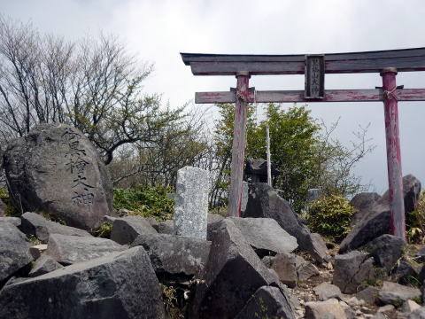 駒ヶ岳からは一旦下る。 11:10 黒檜山との鞍部、大ダルミ通過。 ここから木の階段の付けられた急坂を、約220m登り返す。 ![]() 大ダルミより望む黒檜山 11:35 花見ヶ原分岐通過。 ![]() 鳥居が現れると黒檜山はもうすぐだ 道標に導かれ分岐を右へ行くと、間もなく山頂だ。 11:40−50 黒檜山1828m(大休止・バナナ&オレンジジュース) 大勢のハイカーが寛いでいる。 お昼時でもあり、皆腰を下ろし大休止。我らもスペースを見つけ大休止。 山々が連なる方面は雲で覆われ、展望なし。 ![]() 黒檜山山頂 人が溢れる山頂を後に、黒檜山登山口へ向けて一気の下りだ。 途中斜度が緩む箇所もあるが、概ね急で段差の大きい、木の根と岩の道である。 出発時にストレッチをしていた団体さん達とすれ違ったり、結構まだ登ってくる人がいる。