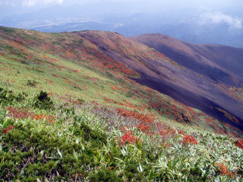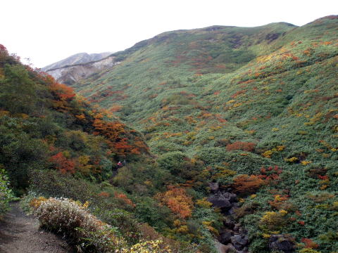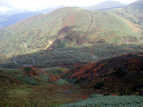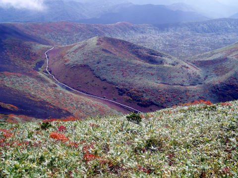 八合目P 11:15〜12:15 秋田駒(男女岳)山頂 12:25〜横岳〜13:20 八合目P 田沢湖駅10:05発のバスに乗り、約一時間で駒ヶ岳八合目着。 事前の情報では、例年だと紅葉の見頃にあたる時期なのだが、今年は残暑が続いた ことで、紅葉の進みが遅れているとのことだった。 山麓車窓からは、駒ヶ岳一帯は雲がかかっており、雲間から時折のぞく山腹も色づい ているようには見えずちょっと残念・・・。 それでも八合目Pに近づくにつれて、雲が切れ晴れてきた。 そして木々の色づきが目立ち始めた頃、八合目P着。 立派な避難小屋とトイレ棟、水場、靴洗い場がある。 11:15 身支度を整え出発。 緩やかな道を行く。 登山道沿いの木々の葉は、近くで見ると痛んでいる。 先日の台風の影響だろうか。瑞々しさがなく色合いもいまひとつである。 ![]() ↑登山道(先行者が見えるかな?) ![]() 旧硫黄鉱山跡を望む ↓笹森山(1414m) ↓湯森山(1472m) ![]() 八合目小屋を望む 遠景は望めないが、眼下にはバスで来た道が見える↓ ![]() 11:35 片倉展望台通過。ガスが湧き上がり展望は得られず(; ;) 道はさらに緩やかに続く。 時折ガスが切れると ↓ わ〜い♪ さすが秋田駒!! ![]() いまひとつの色合いといってもご覧のとおり(^^)v アルプス以来一ヶ月ぶりの山歩きであるが、やっぱり日本の山もいいよね〜♪と ちー隊長と言い合いながら行く。 やがて木道が現れ、視線の先には阿弥陀池と避難小屋が見えてきた。 ![]() 12:00 阿弥陀池避難小屋通過。 ちょうどお昼だったので、池の傍ベンチや小屋の周りはハイカーで大賑わい。 ![]() ![]() 避難小屋から秋田駒ヶ岳最高峰の男女岳へは直登の道がついていた。 12:15 山頂着。遠景は霞み見えない。行動食のパンを食べる。 ![]() 12:25 山頂出発。 来た道を避難小屋へ向けて戻る。 視界には、これから向かう横岳〜焼森の稜線がいい眺め♪ ↓焼森(1551m) ↓横岳 ↓避難小屋 ![]() 男女岳山頂より望む 12:35 避難小屋を通過し横岳へ登り返す。 稜線へ登りつくと、またまたいい景色が待っていた(^^)♪ ↓田沢湖 ![]() ↓ケーキのように見える??(^^) ![]() 12:45 横岳通過。 ![]() 横岳より望む阿弥陀池&避難小屋&男女岳 彩られた緩やかな稜線を下る。 ![]() 乳頭山方面への縦走路を望む 振り返ると紅葉と、光を反射した笹原の斜面が美しい。 ↓横岳 ![]() ![]() くどいようだが(^^)阿弥陀池&避難小屋&男女岳 12:55 焼森通過。ど〜〜んと見えるはずの岩手山は雲の中。 ![]() ここから乳頭山方面への縦走路を右に分け、八合目登山口へ下る。 ↓八合目P ![]() ここまでの緩やかな道に慣れてしまった足に、ちょっとだけ気合を入れどんどん下る。 ↓笹森山1414m ↓湯森山1472m ![]() 13:20 八合目P着。 短い時間ながら、日本の山ならではの和み系の良いコースであった。 再訪の折にはぜひ、乳頭山方面へ縦走したい。 |