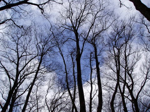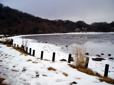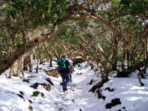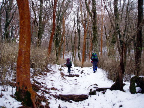 水生地 7:50〜8:10 行幸登山口 8:20〜9:40 八丁池 9:50〜10:30白田峠〜 10:50 戸塚峠 11:05〜11:35 へびブナ 11:40〜11:45 小岳〜片瀬峠〜12:15 万三郎岳 12:35〜13:45 万二郎岳 13:50〜14:45 天城高原ゴルフ場着 7:50 水生地のゲートをくぐり車道を歩き出す。 8:10 本来の登山道が崩落のため改修中で、5分ほど余計に車道を歩き行幸 登山口着。スパッツを着け身支度を整え、8:20出発。 ![]() お天気予報では、北からの前線が南下し、南からの風が前線に向けて吹き込むた め3月上旬並の気温になるとのことで、融雪が進むことが予想された。 里は晴れているのに、天城山稜は灰色の雲に覆われている。 ヒメシャラとブナ林の緩やかな登山道を行く。↓穏やかな景色とはうらはらに、上空 ではぼーうぼーうと、猛々しく風の唸り声が響く。 ![]() 一度車道を横切り、アセビ林が現れ始めると展望台や八丁池口方面からの分岐 となり、八丁池が見えてきた。 9:40 八丁池着。 全面氷結した池と雪景色を楽しみにしていたのだが、↓ご覧のとおり・・・(^^; ![]() 9:50 東屋のある休憩所を後に、以前にも歩いたことのある天城山縦走路へ。 積雪15cm位の、踏跡のある緩やかな登山道を行く。 10:30 白田峠を通過。薄暗い樹林帯の中を進む。 戸塚峠に近づくにつれて、樹間越しに相模湾が見えたりする(^^)♪ 10:50 戸塚峠着。これより先はアップダウンのある山道らしくなるので、行動食 でお腹を満たす。明るくなってきた頭上を見上げると、灰色の雲がとれ、青空も 見えてきた(^^) ![]() 11:05 戸塚峠出発。 前夜お世話になった民宿のご主人から教わった、本山行の予期せぬメインテーマ となる【へびブナ】との出会いを楽しみに歩を進める。 小岳へ300mの標識が現れた所から100m程進み、登山道左側に目印となる 黄/青の札がある。そこから20mほど入ったところにそれはあった。