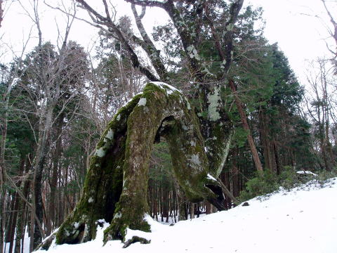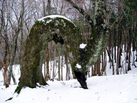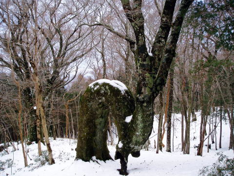各山中で変形したブナや他の木々たちを多数みたことはあったけれど、これほど 奇妙に曲がり佇むものを見たことはなかった。 ![]() 通称:へびブナ ![]() まさしくへびのように曲がりくねったブナの幹 ![]() このアングルだと鹿のようにも見える その背に跨り、この天城の山中を駆け巡れたら・・・なんて想像してしまった(^^)♪ 雪が降っていて、ハイジと【へびブナ】さんだけだったら、そんな妄想も叶うような 気がした・・・。 瑞々しい若葉をつけた新緑の頃はどんなであろうか・・・と思いながら、いくつかの アングルでその姿をカメラに収め、本道に戻る。 11:45 小岳(1360m)通過。 片瀬峠へ向けて下る途中、残雪に黒い木肌&斑模様のブナ林が美しい。 ![]() 11:55 片瀬峠を通過。 12:15 万三郎岳(1406m)着。 相変わらず風は強いが、山頂は晴天な〜り♪ 月曜日ではあるが百名山だし、ゴルフ場からのピストン者がいるのではないかと 思っていたのだが、晴天続きの週末に集中したのか、私達の貸切であ〜〜る。 ![]() 大休止とし、コーヒーを飲みながらパンを食べる。 富士山は生憎雲の中で、見ることができなかった。 12:35 山頂出発。 ![]() 天城山名物?アセビのトンネル ↓万三郎岳 ↓馬の背 ![]() ↓万二郎岳(1300m) ![]() 13:45 万二郎岳着。やはり山頂貸切。 今までの登山道の様子から1時間ほどで下山できそうなので、ゴルフ場までタクシ ーを呼ぶ。(降雪後は道路状況により、ゴルフ場まで呼べない場合もあるので、 事前にタクシー会社へ要確認) ![]() 13:50 山頂出発。ひたすら下る。 14:45 天城高原ゴルフ場着。 14:50に待ち合わせをしたタクシーも、ほぼ同時 に到着(^^) 心配していた登山道の状況も、連日の晴天と本日の高温で融雪が進み、持参し た6本爪軽アイゼンも着けることなく下山した。 八丁池で犬連れのハイカーと出会った以外、誰にも会わなかった静かな山歩き となった。 トイレのある大駐車場へ移動し、帰路に着く身支度を整える。 立派なトイレなのだが、凍結のため12月〜3月は使用禁止である(^^; 仕方がないので、ハイジは伊東駅までもうひと頑張り?我慢する(^^;; 15:00 タクシー出発。 15:40 伊東駅着。(タクシー代¥7,390) |