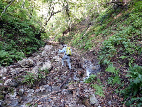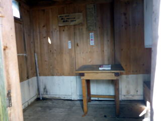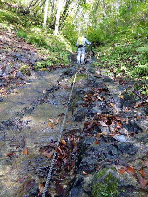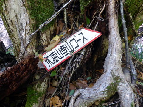 6:50 八総鉱山跡から少し先の路肩に駐車し出発。 ![]() 出発地点 7:00 登山ポスト通過。この間前後に他の車はなく、本日我らが1番乗りだ。 ![]() 沢沿いの林道を行く。 7:15 尾根取付通過。 ![]() 飛石伝いに荒海川を渡り尾根取付へ ![]() 控えめながらコース中随所にこの案内板がある ![]() 7:20 涸沢状の道を行く ![]() 7:30 概ね急坂を行く ![]() 7:35 樹間から左手に荒海山が見えた♪ ![]() 7:40 写真で見るよりも急な斜面はロープがあり安心 7:45−55 尾根鞍部(小休止・オレンジジュース) 展望なしだが、ベンチ状の石が横たわり絶好の休憩ポイントだ。 これまでの急坂と違い、緩やかなブナ林の尾根道を行く。 ![]() 8:10 一つ目のピークを越え、短いながら一旦大きく下り、緩やかなアップダウンを交えな がらの道を行く。 ![]() 8:35 樹間越しに再び荒海山が見えてきた♪ 8:40 尾根道2つ目のピークを越え、再度大きく下り、尾根を緩やかに巻きながら行く。 8:50−9:00 尾根西側を巻いた薄暗い鞍部で小休止。(パン) ここから山頂までは登り一辺倒で、上部に行くほど斜度が増す(^^; ![]() 9:05 男鹿山塊が見えてきた♪ 9:20 テーブル岩(勝手に命名)通過。 ![]() 振り返るとテーブル状に見える岩(^^) ![]() 9:30 下りの大変さが思いやられる急坂!(^^; 灌木帯の痩せ尾根に出る直前は、木の根を掴みながらの滑りやすい急坂だ。 この部分、なぜかお助けロープがないので、登山道中最大の注意を要する! ![]() 9:40 痩せ尾根に立つと一気に展望が開けた ![]() 山頂直下にある南稜小屋