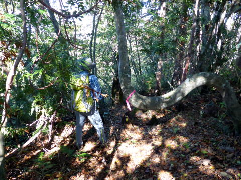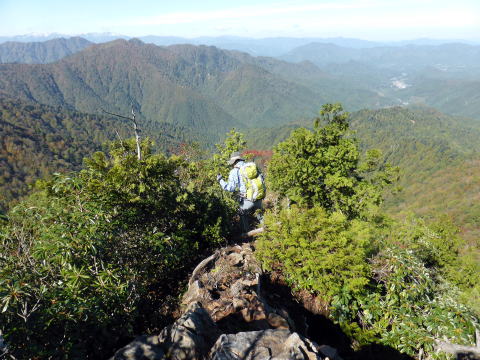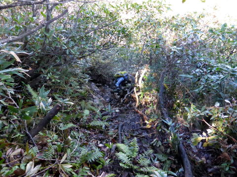 ![]() お隣の東峰(次郎岳)を望む せっかくなので(往復10分とある)お隣の次郎岳を目指したが、背丈を越える笹籔に ハイジは断念(^^; ちー隊長にカメラを渡し、行ってきてもらうことに。 スタートから数分地点であったが、そこから引き返すのも一苦労の凄い籔であった(^^;; ![]() 2等三角点のある次郎岳(なぜか看板は太郎岳とある??) ![]() 次郎岳より望む太郎岳と万歳ハイジ♪(ややズームで撮影) 次郎岳から戻ってきたちー隊長によると、登山道も見難い強力な籔だったそうだ。 風もなく良い天気〜♪ 360°の大展望を楽しむ\(^o^)/\(^o^)/ ↓七ヶ岳 ![]() 荒海山標識右手後方(北側)に見える ↓今年の山開きに登った二岐山(北東方面) ![]() ![]() 東側には男鹿山塊 ![]() 南側正面には高原山 ↓女峰山 ↓大真名子山 ↓日光白根山 ![]() 南西側には日光連山 ![]() 西側には雪化粧された燧ヶ岳 ↓会津駒ヶ岳も雪化粧 ![]() 10:20 名残惜しいが山頂出発。 ![]() ロープのない急坂下りを心配していたが、木の根や枝を掴み後ろ向きで降りる(^^; ![]() 下りはロープの架けられた箇所は積極的に利用する。 木の根も沢山張り出しているので、滑らないよう慎重な足運びを心がける。 10:45 テーブル岩通過。 11:25 本日初めて登ってくる単独のオジサマとすれ違う。 ![]() 11:40 ヘビブナ(勝手に命名)にも巻かれたピンクのリボン 11:50−12:00 往きにも休憩したベンチ状の石のある尾根鞍部で小休止(パン) 12:25 尾根取付通過。飛石伝いに荒海川を渡り林道へ。 12:40 登山ポスト通過。 12:50 八総鉱山跡路肩着。 我が家の車の後方に、オジサマの車が駐車されていた。 本日の登山者は2組計3名か。 |