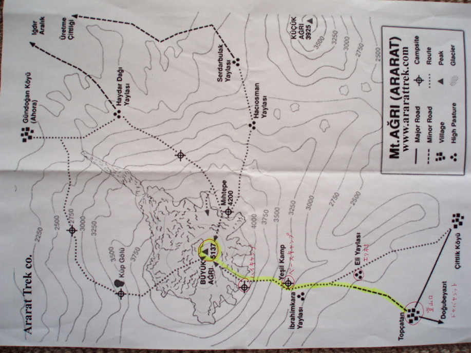 アララット山は、イラン、アルメニアの国境に近い、トルコ東部に位置するトルコ最高峰で あり、旧約聖書にでてくる【ノアの方舟伝説】の山としても有名である。 登山するにはトルコ軍発行の許可証取得と、ツアーへの参加が義務付けられている。 日本からは山旅専門の数社が登頂ツアーを企画しているが、4月上旬、Aトラベル社の カタログを見て日程設定が良かったことと、ツアーリーダーがキリマンジャロでお世話に なったM氏であること、M氏の顧客参加によりほぼ催行決定とのことで、場所柄今後現 地事情が変わると入山できなくなることも考え、早々に申込む。 高度順応日を含め山中四泊五日、アプローチと下山後に観光もついているのが魅力の 山旅だ。ハイキャンプまで、不用な荷物は馬が運んでくれ、食事はコックさんが作ってく れる大名登山であ〜る。 時差:夏時間によりマイナス6時間 装備:12本爪アイゼン、ピッケル、ウェア類はGWの北アルプスを参考に。 ハーネス、カラビナ等指定されたものを持参したが、今回は使用せず。 |