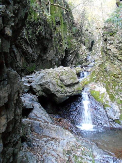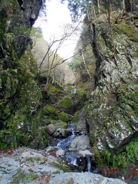 さわらびの湯P 5:15〜白谷沢〜7:25 棒ノ嶺 7:40〜10:20 日向沢ノ峰 10:35〜 仁田山〜有間峠〜橋小屋ノ頭〜12:55 蕨山 13:10〜藤棚山〜大ヨケの頭〜金毘羅神 社跡〜15:15 さわらびの湯P 4:55 起床。朝食は摂らず行動食とする。 5:15 さわらびの湯P出発。 名栗湖(有間ダム)へ向け、緩やかに登る車道を行く。 本日のルートは、名栗湖を囲む山々を巡るのだ♪ ![]() 写真中央に辿る稜線が見える♪ 5:35 白谷沢登山口通過。(白谷の泉は枯れていた) ![]() 今回は滝ノ平尾根コースを行こうかとも思ったが、樹林で展望がないよりも沢沿いの方が 変化に富み、雪のあった前回との対比もしたいので白谷沢を行くことにした。 登山道には、ニリンソウやエイザンスミレなどが見られたが、まだ蕾だった。 薄暗いので撮影失敗(^^; 6時過ぎに白谷沢コースの核心部・ゴルジュ帯現る♪ ![]() 前回沢は雪に埋もれていたので、逆行してはいるもののやはり雰囲気が違う。 道標は整備され、石伝いに沢を数回渡り返しながら行く。 ![]() 楽しい沢道は20分ほどで終わり樹林帯へ。 ![]() 6:30−40 東屋跡(小休止・おにぎり)