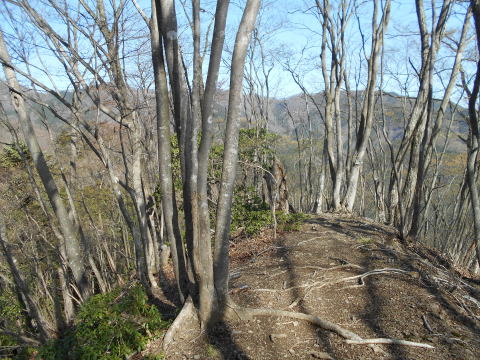 ここまでで本日の行程、核心部を含め半分強。 お腹も満たし、さあ出発! ![]() ![]() 日向沢ノ峰付近より望む蕎麦粒山 10:40 オハヤシの頭分岐通過。右手に下り、ここから有間山稜へ。 本記事にはしなかったが2014年12月、仙元尾根から蕎麦粒山〜鳥首峠山行で歩いた 時が思い出された。細かなアップダウンが続くが、落葉樹林の道は明るくイイ感じ♪ ↓大持山 ↓有間山 ![]() 10:53 鉄塔付近より望むこれから向う方面の景色 ![]() 10:59 下りきると仁田山の分岐だ 11:02 林道分岐通過。 昭文社の地図では、ルートは林道を通っているが、本日は全てのピークを踏むのだ♪