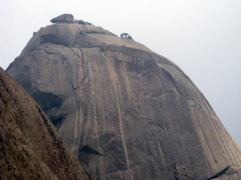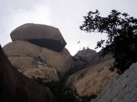 北漢山城(ブッカンサンソン)登山口 9:40〜11:50 山頂 12:30〜13:25 ウイドン登山口着 8:00にホテルを出発。 グババル駅バス停前にてキンパッ(のり巻)とホットサンドを買い、朝食と行動食 にする。 バス乗り場には大勢の登山者がいる。 北漢山城登山口終点までに、いくつかの登山口となる停留所があり、数組の登山 者が降りてゆく。 9:10 終点で降りるが、そこは大通り沿い。どこが登山口か???。 他の登山者の後をついて行けばいいのか???・・・。 皆が同じ方向ではなく、いくつかの方向へ散っていくので困ってしまった。 意を決し、拙いハングルで尋ねてみると、日本語が多少わかるというその方が、 親切に教えてくださった。 大通りを直進し、ハングルの標識を右折すると、登山口駐車場に着いた。↓ ![]() 売店があり、のり巻やくだもの、飲み物などが売られている。 山頂で食べる辛ラーメンと、ポカリ、ミネラルウォーターを買う。 上画像の山が目指す北漢山か?と思いきや、ちがうらしい。 左側にも特徴のあるスクッとした山があるのだが・・・。 通りの右側には山の店やレストラン、カラオケボックスや宿泊施設もある。 駐車場脇の道を山の方へ歩いていくと、券売所が現れた。 9:40 やっとお目当ての登山口から出発。↓(水洗トイレ有り) ![]() 前日のお天気予報は雨だったのだが、ラッキーなことに曇空(^^) 平坦な道を20分ほど行くと再び車道が現れ、ハングルのコース案内があった。 当初は右側のコースを予定していたのだが、沢沿いの左側のコースが良さそう なので、変更する。(どちらでも山頂手前で合流する) ![]() 10:20 売店や有料休憩所を二ヶ所ほど過ぎる。 車道も見え、このあたりまで車で入ることができるようだ。 分岐があり、コース案内板に導かれ、山頂を目指す。 間もなく、本当?に山道となり、人影もまばらになってきた。 ![]() 10:50−11:00 広場にて小休止。 キムパッでお腹を満たし、更なる急登に備える。 11:30 ウィムン(衛門)着。それぞれのコースからの合流ポイントのようだ。 ![]() 衛門(ウィムン) ここから山頂へ向けて、更に傾斜の増す岩道を行く。 ![]() ワイヤーロープの手摺を頼りに、慎重に進む。 ↓大極旗はためく山頂 ![]() 高度を稼ぎ、振り返ると、マンギョンデ(万景台)の岩峰群に人の姿が見える。 ![]() マンギョンデ(万景台) 途中に進入禁止のロープが張られてあったのだが、自己責任で登ってしまう人も 多いということか(^^: ![]() インスボン(仁寿峰) 岩壁登攀で有名なインスボン(仁寿峰)が大きく迫る。 目を凝らすと、クライマーの姿が見える。 ![]() 山頂直下からインスボンを見下ろす ↑の写真を撮り終えて、山頂へ行こうとしたとき、ハングル洪水の中で、すれ違 いざまに思いがけず日本語を耳にし驚く! 異国の山で出会えたことを喜び合い、挨拶を交わす(^^) 広島の山の会のメンバー4人で、私達が下るコースを登ってきたそうだ。 仕事の関係で、10年前ソウルに半年滞在したことのあるメンバーをリーダーに、 ソウル市内からタクシーでウイドン登山口に入ったそうだ。 三泊四日8人でソウルを訪れ、観光組と登山組に分かれたそうだ。 11:30 山頂着。 遮るものが何もない山頂は、836mという標高よりも遥かに高さを感じる。 ![]() 山頂・ベグンデ(白雲台) 霞がかかっているが、うっすらとソウルのビル群が見えた。 狭い山頂でお約束写真を撮り、直下の適当なところに腰をおろし大休憩。 12:30 下山開始。 ウィムンまで来た道を戻り、そこからウイドンへ向けて下る。 12:45 山小屋・白雲山荘前通過。 ここは食事が出来るようだ。井戸があり、水も飲める。 13:00 ソーラートイレを過ぎたところで、インスボンのシャッターポイント↓がある。 ![]() 13:10 ウイドン券売所通過。 13:25 ウイドン登山口売店広場着。 ここからタクシーに乗れるが、バス停目指しアスファルトの道を行く。 5分ほどでトイレと大駐車場が現れる。 売店があり、店頭に山バッチを見つけ購入(^^) 500ウォン(約60円)は安い!! ![]() 14:10 車道を延々歩き、やっとバスターミナルにたどり着く。 発車寸前のソウル駅行 109番バスに乗り帰路につく。(市中心街まで約50分) |