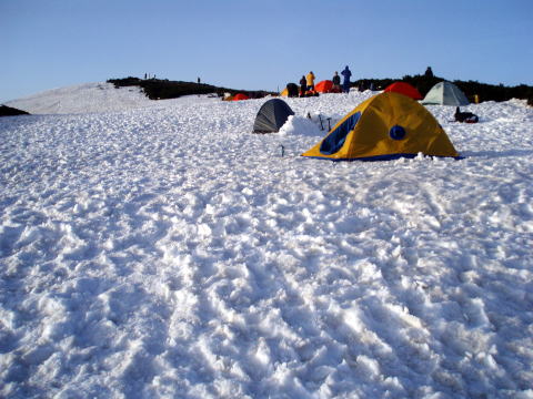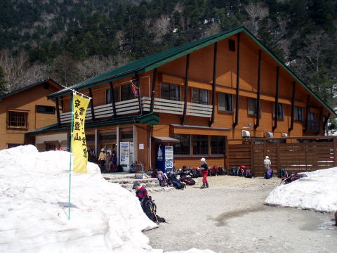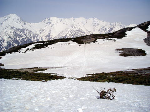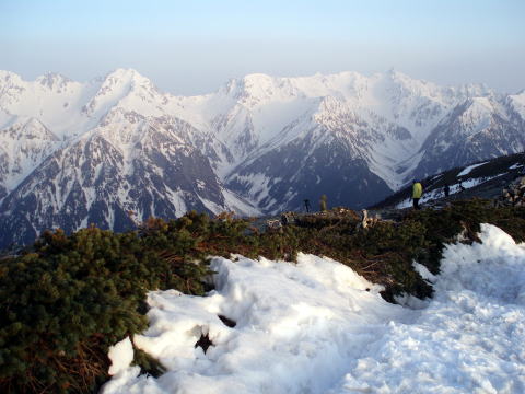 蝶ヶ岳ヒュッテ 8:45〜9:40 蝶槍 9:45〜10:00 横尾分岐 10:05〜10:55 〜槍見台〜11:55 横尾 12:50〜13:50 徳沢 14:00〜15:35 小梨平 5:00 起床。風強し。 もうすぐ日の出。昨日とは違い晴れてはいるものの、槍&穂高の上空には薄い 雲がかかっている。 薄雲のベールをかけた太陽が、かろうじて山々をピンクに染める。 ![]() 肉眼では、涸沢・ザイテングラートや槍沢のトレースがはっきりと見える。 ![]() 奥穂高岳3190m 涸沢岳3110m 北穂高岳3106m ![]() 涸沢カールと穂高連峰 ↓蝶ヶ岳(2677m) ![]() 蝶ヶ岳テン場(5:30)と我が家(手前黄色) 朝焼けの写真を撮り終え、もうひと眠り(^^)♪ 本日は小梨平キャンプ場に泊まるので、時間に余裕がある。 いつもの山行ではありえませ〜〜ん(^^) 7:00 再び起床♪お湯を沸かす。 7:30 フリーズドライの卵スープ、パン&コーヒーの朝食。 8:45 蝶ヶ岳ヒュッテ出発。 少し登ると【瞑想の丘】。 ![]() 瞑想の丘より望む蝶ヶ岳ヒュッテ 方位盤で確認しながら山座同定し楽しむ。 出発が遅いせいで稜線付近は登山者の空白時間帯となり、静かな道を行く。 ↓(旧)蝶ヶ岳山頂 ↓常念岳(2857m) ![]() 9:20 横尾分岐へザックをデポし、蝶槍へ向かう。 凍結箇所がないので、ツボ足のまま進む。 2年前の夏、三股から蝶〜常念岳を歩いたことがあるが、季節が違うので印象も 違い新鮮であ〜る♪(^^) 例年訪れている人も、今年は格段に残雪が多く印象が違うのだろうなぁ〜。 ↓槍ヶ岳(3180m) ![]() ちー隊長と二人っきり ↓大滝山 ↓蝶ヶ岳 ![]() 三角点のある(旧)蝶ヶ岳山頂より望む ↓大天井岳 ↓常念岳 ↓蝶槍 ![]() 9:40 蝶槍着 ![]() 蝶槍より望む 9:45 蝶槍出発。 横尾分岐まで来た道を戻る。 気温が高く白っぽいながらも槍&穂のパノラマ・スカイラインコースは名残惜しい。 分岐の手前で穂高の勇姿を目に焼き付ける。 ![]() 10:00 横尾分岐着。 10:05 出発。 コースガイドで読んではいたが、傾斜のキツイ樹林帯に突入! 食料係なので昨日より少しは荷の軽くなったハイジであるが、緩みはじめた深い 雪道に足をとられバランスとりが難しい。 山にハマる前はスキーにハマッテいたので、雪の斜面に抵抗はないものの、 雪山歩きの経験が浅いのは否めない。アイゼンを着ければ滑ることはないのだ ろうが、極力雪道を足で感じ、滑らせる技術も身につけたいのでツボ足で進む。 ちー隊長は慣れたもので、大きいザックながらもスイスイと下りてゆく。 ![]() ↑達人・ちー隊長(^^) 10:55 けっこう頑張って快調?に下り槍見台通過。 鬼のような急傾斜道が延々と続く・・・(^^; 登ってくる数パーティーからも、あとどれくらいで稜線に出ますか?と訊かれ たっけ(^^; そう尋ねずにはいられない気持ちが、よ〜〜くわかります(^^;; 高瀬ダムから烏帽子岳へのブナたて尾根を直線的にしたかんじ。 なんとかちー隊長の姿を確認しながら下れたのも出発後1時間少々。 雪はさらに緩み、一歩一歩がより深く沈むようになり、足がだんだんだる〜くなっ てきた。当然ペースも落ちる。 ちー隊長はハイジを待つための時間ができ、ハイジが追いつくと『休む?』と問い かけてくれるのだが、なるべく頑張ろうと自分自身に誓って?いるだけに頑張る。 が・・・、1時間半過ぎたあたりからは根性や気合ではどうにもならなくなってきた。 少し平らになったところで5分ほど小休止。 ![]() 11:55 横尾山荘着。ラーメンを作り大休止。 ![]() 屏風岩と横尾大橋 横尾山荘前は、槍や穂高からの合流点となっていることもあり、日に焼けた多く の山ヤさん達で賑わっている。 無雪期と違い、中高年者よりも年齢層の若いパーティーが多い。 連日の晴天、どの顔も満足感で満ち溢れているように見える(^^)♪ ![]() 横尾山荘 12:50 横尾山荘出発。 横尾側半分ほどは夏道は雪の下で、河原道のほうが歩きやすそうだ。 13:50 徳沢着。 14:00 徳沢出発。 15:35 小梨平キャンプ場着。(テン場代・一人¥700) キャンプ場にはコテージやお風呂、売店や軽食堂もあるようだ。 テント設営後、上高地バスターミナルの売店へ。 穂高の山バッチと赤ワイン、スモーク馬肉を仕入れ、河童橋前の売店で500ml エビス(¥350!安い♪)購入。 16:30 宴のはじまり〜(^^)♪ 仕入れたフルボトルワインとスモーク馬肉は相性バッチリ(^^)v 持参した漬物とチーズにナッツ。 山と酒の日々、たまりませ〜〜〜ん(~ ~)♪ 18:30 夕食。五目御飯と韓国海苔&お味噌汁。 食後に残った焼酎のお湯割りでシメる(~ ~) このキャンプ場は焚き火をしてもいいようで、そこここで火を囲むグループを見る。 いつもは通り過ぎるだけだった小梨平キャンプ場の雰囲気を味わう。 20:00 消灯。 |