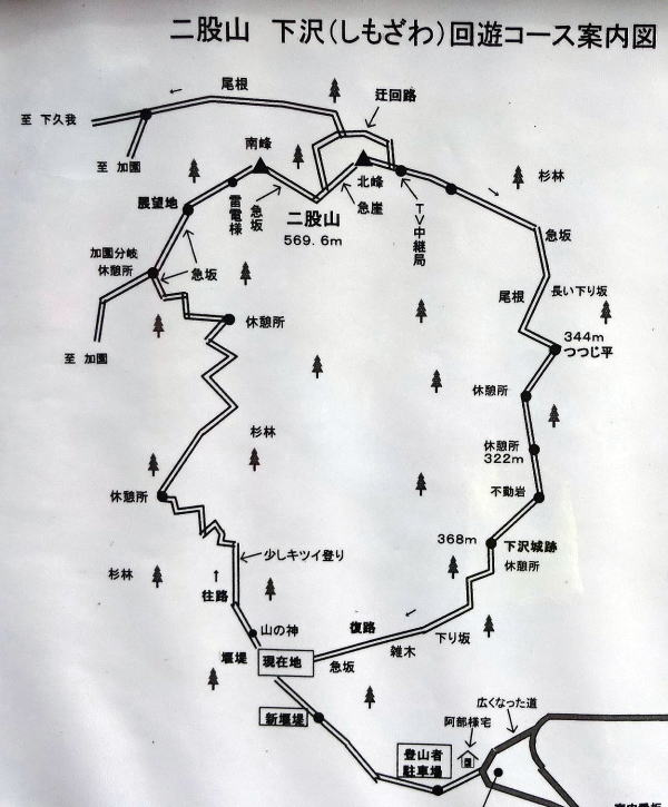 阿部様P 9:20~10:10 展望地 10:20~10:28 二股山南峰 10:30~北峰~下沢城跡~11:35 阿部様P