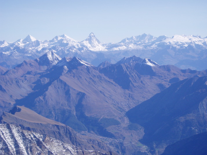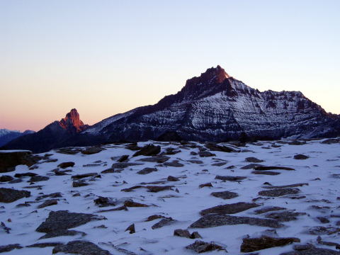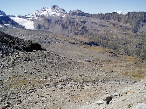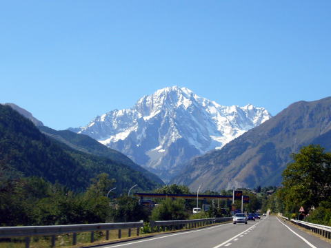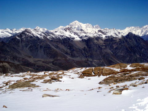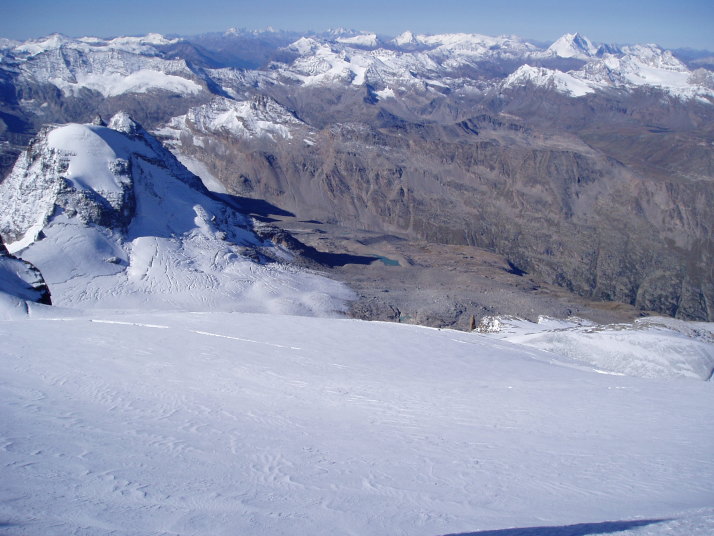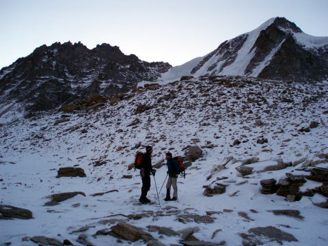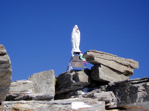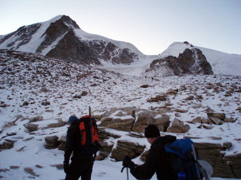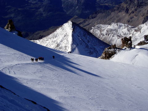 エマヌエーレ小屋 5:20〜6:55(アイゼン装着他)7:10〜9:35 山頂 9:40〜 10:45(アイゼン外し他)11:00〜12:10 エマヌエーレ小屋(昼食) 13:15〜 14:50 登山口P着(標高2735m〜4061m〜1960m) 4:15 起床。 4:30 朝食。(パン、コーヒー、紅茶) ハイジはパンは一枚のみにして、持参のウィダーインゼリーを飲む。 5:20 ヘッドランプをつけ出発。頭上は満天の星。 今の所風もなく、厚着をしてしまったので寒くはない。ハーネスも予め着けておく。 ザックの中は、アイゼンとポカリ1L、テルモスのお湯、ウィダーインゼリー2袋。 行動食のアーモンドチョコ1箱。雨具の上ポケットにもウィダーインゼリー1袋。 先発隊は、40〜50分前に出発している。 アイゼン装着場所までは、ガイドさん達の後を、各自勝手について行く。 旧小屋の脇を抜け、岩ゴロ道を緩やかに登る。 歩き出しから、ハイジ的にはペースが速い。 ステファンは小柄だが、チェリーは大男で、足の長さはハイジの2倍以上あると 思う。ステファン、チェリー、Sさん、A氏、I氏、ハイジ、ちー隊長の順に進む。 先発隊をどんどん追い越すので、厚着のせいもあり、息が上がる(^^; 30〜40分過ぎる頃、ハイジは2〜3m遅れてしまう。これが本場アルプスペース なのね・・・。ぜいぜいしながらついて行く(^^; さらに連なる7〜8人を抜くため、5〜6m遅れてしまったところで、ステファンが 止まった。皆それなりに厚着をしていたので上着を脱ぎすぐ出発。 再出発時はハイジがステファンの後ろを歩くことに。I氏に、私が先頭を歩いてく れたほうが、ペースが助かると言われ譲られる(^^; やっぱり皆それなりに苦しかったのね。 道はちょっとした岩登りとなり、先発組をここでも抜く。 夜がだんだん明けてくる。 6:40頃 朝陽が周囲の山々を照らし出す。 道は緩やかになり、岩道に積もった雪が、所々凍っている。 6:55 アイゼンを着けるよう指示される。出発まで何分との指示はないので、 急いで装着し、日焼け止めを塗り、ポカリを飲み、写真を撮る。 どれも大事なことなので省略できず、すごく慌しい(^^; ![]() 朝陽に照らされた来た道の方(西)の山々 ↓ダン・デュ・ジェアン4013m ![]() 朝焼けのモンブラン4807m(左) グランド・ジョラス4208m(右端) ![]() ![]() チェリーとステファン ↓稜線 ![]() 7:10 ステファンに、ハイジ、ちー隊長、Sさんの順にアンザイレンされ出発。 チェリー組はA氏、I氏の順である。チェリー組が先行する。 道は氷河へ向けて一度下る。 氷河上を稜線へ向けて登り返す。 グラン・パラディゾの山頂は、上画像左の山に隠れ見えない。 氷河上をトレースに従い登る。ペースは朝の速さがうそのように、一歩一歩ゆっく り進むので拍子抜けしてしまう(^^) 20cm位のクレバスを跨ぎ、雪の斜面を行く。稜線上まで、チェリー組の後へ 連なり進む。 8:40 稜線上へ出る。Sさんのアイゼンが片側ズレているので、ステファンに 再度着けなおすよう指示される。 山頂方面を見るが、ルートはここから左へトラバースしながら行くようで、見る ことができない。 8:45 出発。 トラバース気味に高度を稼ぐルートは、所々青氷があり、慎重に進む。 下りのパーティーとすれ違ったり、高所でペースの落ちた登りのパーティーを 抜いたりしながら、小コルに到着。ここで初めてスイス方面が見えた。 ステファンからザックをデポしていくよう指示される。 空身でステファンの後に続く。 9:35 簡単な岩登りを経て山頂へ。(※注:正確には山頂手前10m位の場所。 強風にて安全が確保できないとのガイドの判断で、ここで登頂とみなし引き返す) 山頂には立派なマリア像があった! ![]() 360°大展望であるが、そこは4000m越えの独立峰。 風が強い。のんびり写真を撮ったりしたかったのだが、ステファンは強風なので 数枚写真を撮ったらすぐ下りると言う。 慌てて撮ったので、モンブラン方面は撮影失敗(> <;) 9:40 名残惜しいが、下山開始。 小コルでデポしたザックを回収し、先頭Sさん、ちー隊長、ハイジ、ステファンの 順で出発。 ![]() 小コルより望む 来た道をどんどん下る。稜線から氷河へ下る斜面では、サラサラの雪なので、 アイゼンを着けていても滑らせながら、どんどん下る。 スキーのようにバランスをとりながら体を進行方向へ落として行くので、初めて 使ったストックは有効だった(^^) 10:45 氷河上から少し登り返して、平坦なポイントへ。 アイゼンを外し、小休止。日焼止めを塗り、ポカリを飲み、ウィダーインゼリーを 飲み、写真を撮る。忙しい(^^;。 ↓山頂はこの山の陰 ↓稜線 ![]() ![]() 白く輝くモンブラン♪ 11:00 出発。 ここからはトレッキングルートなので、ガイドさん同士が先へ進み、メンバー4人 は御気楽モード。 下ってみると、暗い中登ってきた道は、結構斜度があったのだ(^^; 途中一箇所岩場を通り終えたところで、ハーネスを外す。 ↓ちっちゃい灰色が小屋 ![]() 12:10 エマヌエーレ小屋着。 祝杯のビールをグビッといきたい所だが、なにを隠そうちー隊長は【うわばみ】 なのに、峠道を走る車に弱