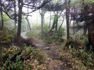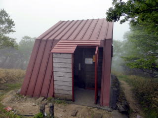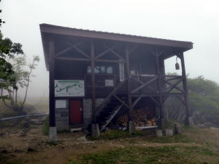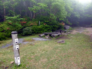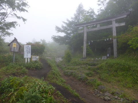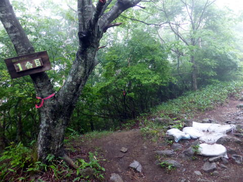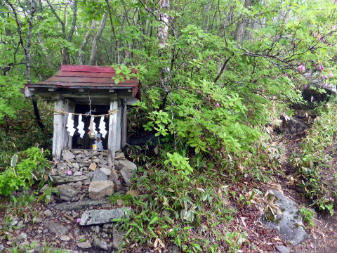 畳石から8合目までは樹林帯の普通の登山道となる。 ![]() ![]() 8:35 登山道脇随所に祠あり 8合目を過ぎると植生が変わり、笹と五葉松の平坦な道となる。 ![]() 8:55 しゃくなげ山荘通過。(水場&トイレあり) しゃくなげ山荘から一段上がった広場を左に折れ進む。 9:00 日枝神社通過。