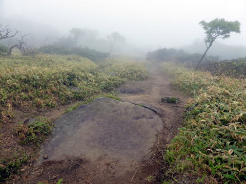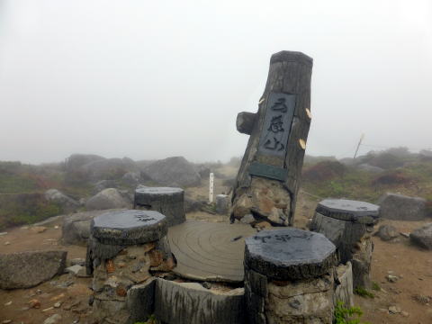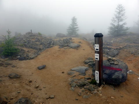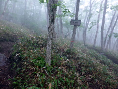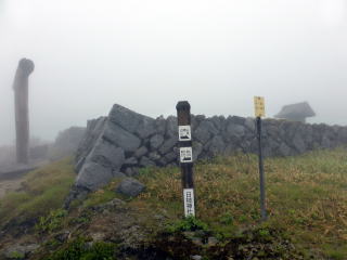 ![]() 神社から山頂部は平坦な広い尾根道。迷わないようロープが張られている 9:10 五葉山(1341m)山頂通過。霧で展望なし(; ;) ![]() 太い標柱が折れていた(^^;