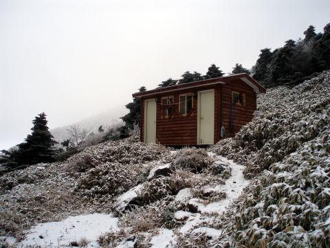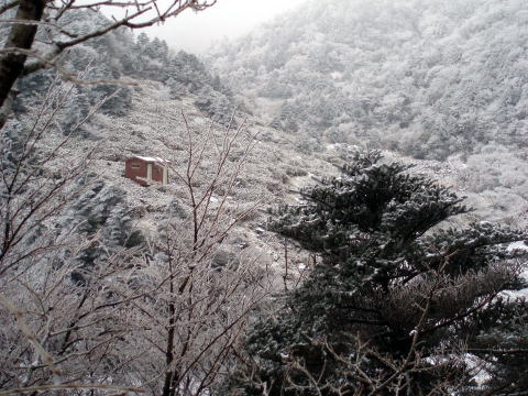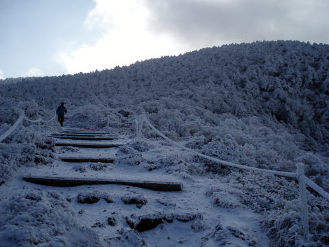 観音寺登山口(620m) 7:10〜11:15 山頂 11:20〜15:00 城坂岳登山口(750m)。 前日空港からの移動で乗ったタクシードライバーの高さんに交渉し、6:30ホテルに 迎えにきてもらう。20,000ウォンは適正価格かどうかは??であるが、早朝利用& 登山口は不便な場所で、帰りのお客さんを期待できない事情から良しとする。 6:50 観音寺登山口管理事務所着。まだ暗い。 広い駐車場には数台の車が停車していた。以前は管理事務所で入山料を支払った が改定されたようで、無料とのこと。 本日の山行コースを告げると、装備(軽アイゼン等)を質問される。 7:10 身支度とトイレを済ませ登山口出発。 ヘッドランプを用意したが、夜が明けてきたので使わずに行く。 ドライバーさんによると、ハンラサンは四季を通じて(真冬でも)登られており、平日は 静かだが、この時期でも週末は結構な人で賑わうそうだ。 葉の落ちた冬枯れの乾いた道を行く。今の所道に雪はない。 道標も含め、以前よりも更に整備された道を行く。 俊足の地元の方二人に先を譲り、鳥さんたちの朝のミーティングをBGMにのんびり 歩く。 8:10 タンナ渓谷待避所着。(小休止) 以前にあった古い小屋はなくなり、新しい小屋と別棟にトイレが設けられている。 ![]() タンナ渓谷待避所内部 8:20 出発。 昨夜はEマートで仕入れたお刺身などで、ホテルの部屋で夕食兼酒盛りをした。 もちろん本日に備え軽めに済ませたので、体調は上々のハイジであ〜る(^^) 静かな道を淡々と進む。 登るにつれて辺りは雪景色となってきた。 ![]() 海抜1300M表示の石柱 樹林帯のため風が遮られており、積雪5cm位の道は今の所凍っておらず歩きやすい。 樹林帯を抜けると、正面に三角峰がど〜〜んと聳える平坦地だ。 ![]() 9:45 三角峰ベンチ通過。風が吹きつけ寒いので、休憩せず進む。 北東方面の開けたところは、↓うわ〜っ! 曇っているものの一面霧氷で美しい♪ ![]() 城坂岳コース方面を望む 墨絵の世界に装われた三角峰もカッコイイ! ちー隊長と二人きり、誰もいない風音だけの空間に融けてしまいそう。 ![]() 三角峰(1695m) 道は三角峰を巻き、一度下る。曇ってはいるが、ガスがかかり幻想的な景観に 囲まれるように付けられた道は、ハンラサンの懐の中に包まれるようだ。 ![]() 竜鎮閣待避所を望む 下りきった所のコースを少し外れた箇所に水場があるのだが、道が付け替えられた ようで以前よりも遠くなっており、滑ると危ないので寄らずに通過する。 10:05 少し登り返して竜鎮閣待避所着。(小休止) 以前はこの小屋の登山道を挟んで反対側に、古い小屋とトイレがあった。 新たなかわいらしい小屋の中を撮影しようとしたが、鍵がかかっており叶わず。 小屋の手前に別棟でトイレがある。 ![]() 10:15 バナナを食べ出発。 この先は20分程急登が続く。 時折雲がきれ、青空がのぞく。この調子で、山頂では晴れますように・・・。 ![]() 間もなく、今朝私達を抜いていった登山者が下りてきた(速い!!) 山頂の様子をきくが、芳しくなかった(^^;) 斜度が緩み始めると視界はいっそう開ける。 振り返るとオリモクコースの稜線が見える。↓ ![]() 行く手には、ハンラサン直下を巻きぎみに頂上への道が付いている。↓ ![]() ![]() 長鼓項(1813m)を望む ほどなくして木々に視界が遮られ、最後の登りを淡々と行く。この辺りから何人もの下山 者とすれ違う。殆どが観音寺コースを往復する人のようだが、お話をしたうち一人だけ、 城坂岳コースからの登山者だった。 ひと登りすると現在通行禁止となっているオリモクコースからの合流道が現れ、そこか ら山頂まではとてもゆるやかな道だ。 ![]() 山頂手前より望む 11:15 山頂着。うぅぅ・・・(; ;)山頂標識以外、濃いガスで周囲の景色は全滅だ。 そしてとっても風が強い! ![]() ハンラサン東稜頂上標識 11:20 記念撮影の順番待ちをして、写真だけ撮り出発。 ここから下山口まで、9.6kmの道のりだ。 ハンラサンは日帰り登山が原則で、山頂からの最終下山時刻が決められている。 各月が3つのグループに分けられており、グループ毎に30分前後するが、11月 〜2月は、13:30が頂上からの下山時刻だ。各登山口等で最終入山時刻も決め られている。 明るくなって登り始めた城坂岳コースからの人々が、ぞくぞくと登ってくる。 ![]() 観音寺コースとは対照的に、単調で賑やかな登山道だ。多くの一般ハイカーが 城坂岳コースを往復するそうだ。 それは、このコースには、これから向かう有人の【つつじ畑待避所】があり、広めの 造りで売店もあり、カップ麺やコーヒーなどがいただけるためもある。 ![]() 頂上手前30分くらいは、やや急な階段道だが、コースの殆どが緩やかなお散歩 道なのだ。なので、あらゆる人が、あらゆる格好で登ってくる。殆どのグループは 縦一列に歩くのではなく横に広がり、もちろん道を譲ったりはしない。 これは、雪嶽山や北漢山でもそうであったが、そーゆーマナーになっていないの か???、日本式に登り優先で(登りに限らないが)すれ違い時、手前で待っ