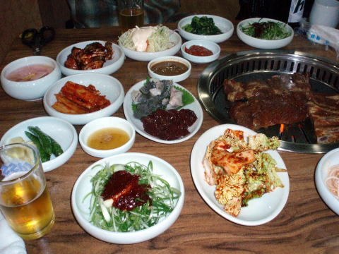 下山後のお楽しみ。チェジュ島といえば、お約束のテジカルビ(黒豚カルビ)。 あちらこちらにお店があるが、私達は疲れた足で探し歩いた。 高級店を探すのは容易だが、地元民で賑わう手頃なお店を。 ![]() お腹空きすぎていてお店の名前を忘れてしまったが、場所だけは覚えているので 次回も再訪したいと思う。 ビール4本と焼酎(300cc)一本&お肉二人前で、24,000ウォン。 付け合せに数種類のキムチとカニのしょうゆ漬け、塩辛とセンマイ刺し&レバ刺し、 呑んベエにはたまりません!お肉も量が多くて食べきれなかった(^^; 翌日(帰国日)は15:30まで自由時間だったので、路線バスを利用して西帰浦方面 の観光へ。ひょんなことから現地のオジサマに、郷土料理の美味しいお店まで連れ て行っていただくというオマケ付き♪ 地元の人で賑わうそのお店で、太刀魚のスープと鮑の海鮮チゲをいただく。 独学している韓国語は、拙いながらも訪韓するたびに牛歩の上達をしているようで なんとか現地での目的を果すことができて嬉しい(^^) 体重が1kg増量されるという、喜べないオマケもついた(^^;;; |