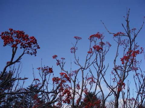 戸隠中社 10:35〜飯縄山短縮登山口〜11:25 萱ノ宮 11:30〜12:40 飯縄山 13:00〜瑪瑙(メノウ)山〜戸隠スキー場下〜15:00 奥社バス停 10:30 中社宮前バス停着。 連休週末なので、行楽客で賑わっている。 開店直後にもかかわらず、そば処・うずら家前は黒山の人だかり(^^; 10:35 戸隠中社出発。 戸隠スキー場民宿街を抜け、湯行館〜ちびっこ忍者村脇を通り西登山道口へ。 林道突当りの所に、本来の登山口をややショートカットできる短縮登山道があった。 10:55 短縮登山道通過。 落ち葉の敷かれたカラマツ林の静かな道を行く。二人共デイパックの軽装なので、 小学生の遠足みたいだ(^^) 登山道脇にハナイクチやシメジ風のキノコを見つけながらのお散歩♪ 匂いにも敏感なちー隊長は、キノコ類が苦手にもかかわらず見つけるのが上手い。 が、そんなわけで、キノコ採りして今夜の鍋というわけにいかないのが残念!(> <) ![]() カラマツの落ち葉降る道を行く。雪のように沢山降ってくる! 11:25−30 小さな祠のある萱ノ宮着(小休止) ちー隊長の頭に、カラマツの落ち葉が沢山くっついているのが可笑しくて指摘すると、 『ハイジの頭にだっていっぱいくっついているよ〜♪』・・・自分のは見えないもんねぇ。 お互いに相手の頭上の落ち葉を払い出発。 林の中ではすぐに積もっちゃうんだけど(^^;) カラマツ林を抜けると一気に視界が開けた。振り返ると↓(^^)v ![]() 戸隠連峰 ↓鹿島槍 ![]() 肉眼では雪を頂く北アルプス・後立の山々が、白い雲間にかろうじて見える♪ ![]() 飯縄山南峰(1909m)を望む 霞んではいるものの、尾根道歩きは気持ちよい♪ 南登山道の分岐を過ぎ、もうひと登りで飯縄神社のある南峰だ。 12:30 飯縄神社通過。 ![]() 南峰より望む飯縄山(北峰) 12:40 飯縄山山頂着。(大休止) 登山道ではあまり人に会わなかったが、お昼時でもあり山頂は賑わっている。 空気が澄んでいたら360°大展望のハズなのだが・・・、東側(長野市街)の展望 は御覧の↓とおり全滅です(; ;) ![]() ↓西側には戸隠連峰と、(雲が邪魔だが)ピラミダルな山容が一際目を惹く高妻山。 ![]() ↓北側には黒姫山。妙高山は雲の中だ・・・。 ![]() 13:00 山頂出発。 帰路は瑪瑙(メノウ)山を経て戸隠スキー場へと向かう。 霞んではいるものの、右側に焼山&火打山、黒姫山、正面に戸隠連峰と高妻山を 見ながらの絶景ルートだ♪ 戸隠連峰 ↓瑪瑙山(1748m) ![]() ↓焼山 ↓火打山 ↓黒姫山 ![]() 紅葉(黄葉)の最盛期だったら、山々はどんな模様のセーターを着ていたんだろう♪ と想像しながら歩く(^^) 13:40 瑪瑙(メノウ)山通過。 ここからスキー場下部までルートは二つあるが、どちらでも下部で合流する。 私達は右側のルートを選ぶ。 ↓飯縄山(北峰) ↓南峰 ![]() ![]() ナナカマドの実 スキー場コースの中を行くルートは↓御覧のとおり(^^)v ![]() 山歩きにハマる前はスキーにハマッていたハイジであるが、不便なため戸隠スキー 場は訪れたことがなかったが、こんな絶景コースだったのか!と新鮮な驚き。 岩岩した戸隠連峰とカッコイイ高妻山の景観は、シャモニで見た景色を思わせる。 雪化粧の山々を想像するだけで、ドキドキ♪(^^) ![]() スキーリフトと高妻山 ちー隊長と二人きり、トレイン?しながら、スキーコースをどんどん下る。 14:30 戸隠高原ホテル通過。 私達はキャンプ場に戻るため、奥社のバス停を目指す。 西岳の稜線を眺めながら、来春きっと歩こう思う。 ![]() カラマツの林道&西岳 15:00 奥社バス停着。 下界は相変わらず行楽客で車だらけの人だらけだ(^^; 適当なバス便がなかったので、奥社の車道から一本入ったところにあるハイキング コースを辿り、キャンプ場へ戻る。(奥社バス停 15:00〜15:30 戸隠キャンプ場着) |