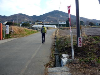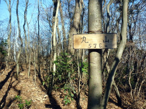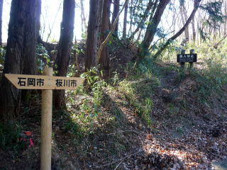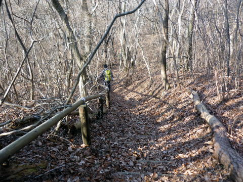 発電所内にも案内板はなく、ピークの手前にある風車2号機の先は行き止まりだ。 しか〜し、ちー隊長はがぜんやる気を出し、後ろのピーク目がけ藪をこぎ出した(^^; ハイジは労力を節約し、ちー隊長の合図があるまでそのまま待つことにした。 待つこと数分、「あったよ〜〜! 山頂標識」と、ちー隊長。 適当に斜面を登ってこいとのこと。 標高差にして10mもないくらいだが、少しの間アキレス腱伸ばしっぱなし状態にして慎重 に登る。周囲の幹を掴みたいところだが、細い幹は折れやすく刺状になっていて掴めない。 10:45 丸山(576m)山頂。写真を撮り通過。 ![]() 丸山に山頂標識はあったものの、筑波山の坊主山のように本来は登山道はなく、地元愛好 家の方々により付けられたように思われる。(※注:坊主山より踏み跡薄い) 山頂に案内板はなく、下山道もはっきりしないが、踏み跡を頼りに足尾山方面へ向かって行 くと、随所に赤テープの巻かれた枝があった。 低山ハイクだし〜と、道標はすっかり整っているとばかり思っていたので、丸山ピーク周辺は、 プチバリエーションを楽しめ、気持ちも引き締まり、この山行のアクセントになった。 踏み固められた階段状の道を下りきると、車道に出た。 下り立った車道には、丸山への案内標識はなかった。 11:00 一本杉峠通過。 一本杉峠には、足尾山方面への道標はあるが、それは車道歩きを示すものだった。 登山道を歩きたいので、それらしい方向についている道を行く。 ここを通り登山道へ↓