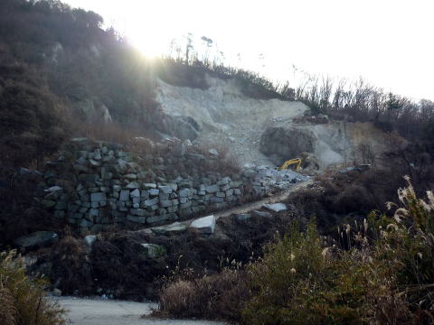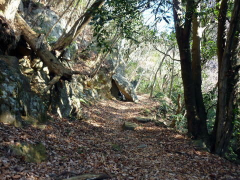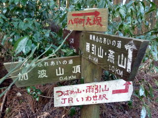 標識は二手に別れており、??と思ったが、五合目と案内されている方を選ぶ。 寝不動尊左脇の道を渡り、山道にとり着く。 とても緩やかな道が五合目手前まで続く。 30分ほどで車道に出合う。 三合目〜四合目を通るもう一方の道も、ここで合流しているようだ。 ![]() 右手に採石場を見て車道を進むと、五合目登山口に突きあたる。 9:15 五合目通過。(石柱と祠あり) 9:25 六合目通過(石柱あり) ![]() 落ち葉の敷き詰められた緩やかな道 9:35 七合目・山椒谷通過。 ![]() 9:45 八合目通過(石柱あり) 9:50 林道(車道)を横切り、九合目通過。(石柱あり) 間もなく縦走路に出た。