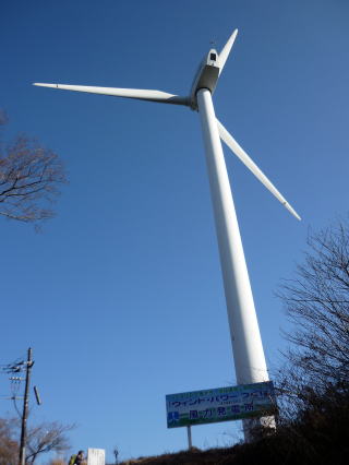 ![]() ブナ林もありました〜♪ ![]() 10:30 旗立石通過 階段状の道をどんどん下ると、風車が見えてきた。 ![]() 階段を下りきると車道に出だ。(大きな石のモニュメントあり) 丸山への案内標識は見当たらず・・・。 とりあえず、風力発電所内(風車2基)を通り、丸山と思しきピークを目指す。