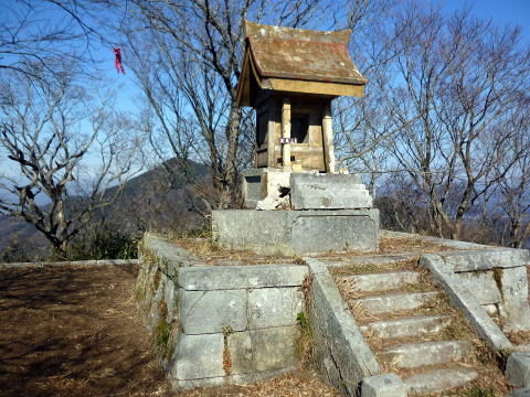![]() 加波山神社・山頂拝殿 この後いくつもの神社が続くことに・・・(^^; 縦走路は山頂拝殿脇を通る。 たばこ神社脇を通り、五分弱で加波山山頂だ。 10:05−15 加波山(709m) 小休止。山頂に加波山神社・本殿がある。 ↓加波山神社・本殿 ↓この木の手前に三角点がある