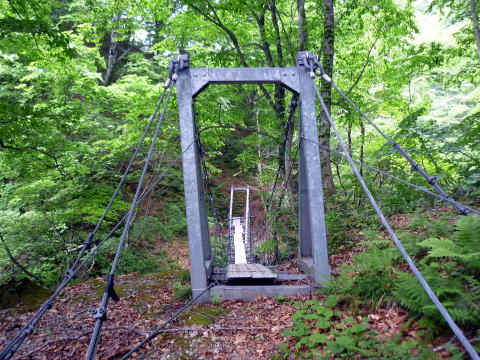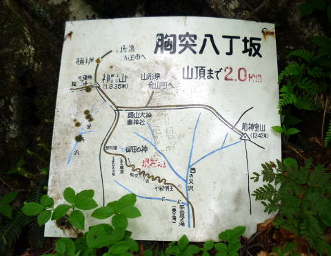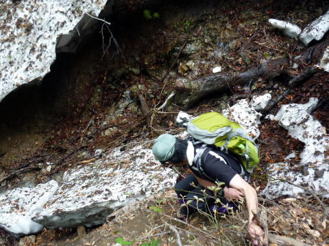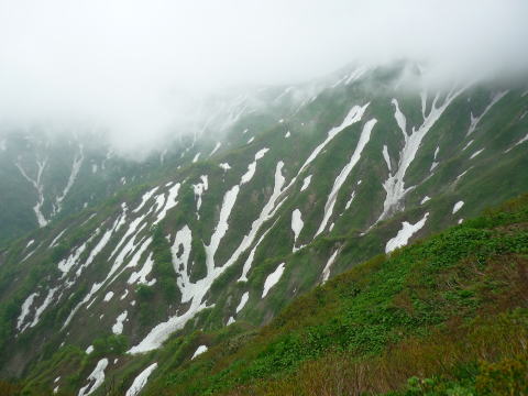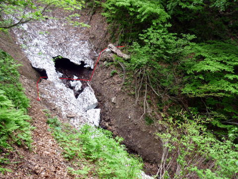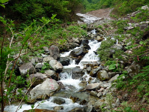 西ノ又コース登山口P 6:50〜8:35 不動明王 8:45〜10:20 神室山 10:50〜11:50 前神室山 11:55〜13:35 西ノ又コース登山口P 6:00 宿出発。 R108 小学校を右手に、信号を左折(釣りキチ三平・撮影地の看板あり)。 神室山の道標に導かれながら集落を抜ける。 ![]() 集落から望む神室山方面(前日撮影) 登山口P手前約2kmは、悪路のダート道が続く。 ![]() 鳥居の先から悪路が始まる(^^; 6:25 西ノ又コース登山口P着。(トイレ、水場なし) 平日&雨予報なので我らだけかと思っていたが、静岡ナンバーの車が停まっており、 既に出発されていた。 宿で作ってもらったおにぎりを食べ、身支度を整える。 今朝見た天気予報では降水確率60%だったが、今の所、空は明るく、すぐに降ってきそ うにもなく、予定通り沢沿いの西ノ又コースを登ることにする。 昨夜の天気予報では、降水確率70%&未明から雨だったので、出発時から雨具を着け 尾根道のパノラマコースを往復するつもりでいたのだ。 6:50 西ノ又コース登山口P出発。 ![]() 赤線方向:西ノ又コース 水色線方向:パノラマコース 緩やかな林道を行く。 7:15 第1吊橋通過。 ![]() 7:25 第2吊橋通過。 ![]() ![]() 清々しいブナ林 熊鈴を響かせながら林を抜けると、視界が開け、難所現る! スノーブリッジが壊れ、行く手を阻まれてしまった(^^; ![]() 対岸へ行くための道はなく、壁状の所を2m強沢へ向け下りなければならない・・・。 実線コース(一般道)だったので、補助ロープの用意もしてこなかった。 ![]() 暫し思案の後、ちー隊長が木の枝を掴み、ソロリと下りて行く ハイジもちー隊長に倣い慎重に下りる。掴んだ枝は十分な長さはなく、とても緊張した。 対岸部手前に一部残る雪のトンネルを潜り通過する。 ![]() 赤線が難所通過部(手前方向に辿る) ![]() 難所を渡った先も、傾斜のついた崩れやすい細い道が続く 足裏神経使う道が終わる頃、空が開け、大きな滝が見えてきた。 ![]() 三十三尋の滝 8:25 西ノ又徒渉点通過。 ちー隊長は、ペンキ印通り飛び石伝いに行けたが、ハイジは足が届かず無理だったの で上部に進み、雪渓の手前辺りを渡る。 ![]() 西ノ又徒渉点 8:35−45 不動明王(小休止・オレンジジュース) 傾斜のついた狭いトラバース道や、足元の不安定な場所を早く抜けたい一心でいたせ いか?、予定より大分早めに着いた(^^)v ![]() 不動明王 まだ雨は降ってこず、沢から離れ、ここから尾根道を辿るので一安心♪ 不動明王から御田の神まで、胸突八丁坂と呼ばれる標高差400mを登るのだ。 悪路より、急登の方がマシだ(^^; ![]() 胸突八丁坂は急とはいえ、歩いてみると普通位?の急さで歩きやすい。 ツバメオモトやカタクリ、ショウジョウバカマやミツバオウレンなど、この時期の花々が 目を楽しませてくれる♪ しか〜〜し、その分、虫もいっぱい!! 今日は抜かりなく、ハッカ油と顔周りはネットで覆いフル装備(^^; ![]() 前神室山を望む ![]() 雪渓を抜けると傾斜が緩む 9:45 御田の神通過。 結構いいペースで来れた(^^)v 疲れてもいないので、休憩せずそのまま行くことに。 ![]() ![]() 御田の神周辺は、ヒナザクラが群生していた♪ ↓神室山方向 ![]() 御田の神から2つ目の雪渓 2つ目の雪渓は広く、ガスが出ていた場合ルートが分かり辛いだろう。 雪渓を縦断し、左奥に夏道があった。 ![]() 夏道から振り返り、前神室山を望む 窓くぐりの手前で、キヌガサソウの群落が見られた♪