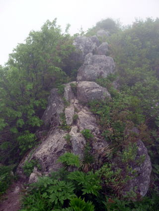 9:55 窓くぐり通過。 晴れていたら、ど〜〜んと神室山が見えるハズなんだけど・・・。 雨予報だったので、今まで降られないだけでも良しとしなくっちゃあ(^^) ![]() ガスの切れ間に、美しい縦縞模様が現れた〜♪ ![]() シラネアオイも斜面に沿って沢山咲いていた♪ 10:10 西ノ又分岐通過。 ![]() ![]() 来た道を振り返る 山頂まで緩やかな尾根道だが、一箇所両側切れ落ちた岩場がある。 ![]() 岩場(振り返り撮影) 10:20 神室山着。避難小屋で休憩するため写真を撮り通過。 ![]() 山頂からわずかに下ると避難小屋だ。 ![]() 10:25 神室山避難小屋着(大休止・おにぎり) ここまでで誰にも会わず、避難小屋にも誰もおらず我らの貸切。 静岡ナンバーの人は、パノラマコースを往復されたのだ。