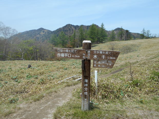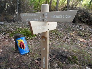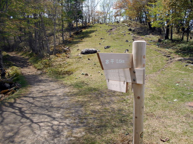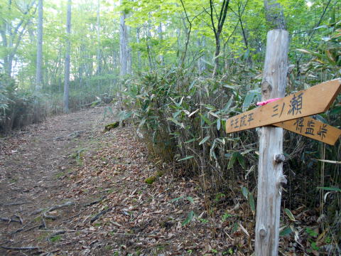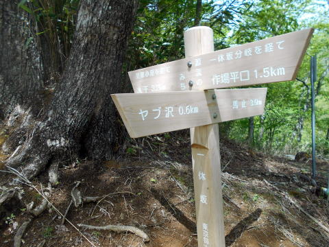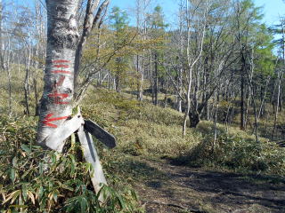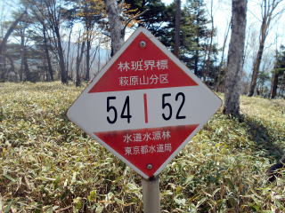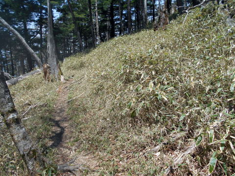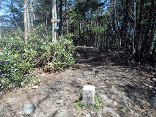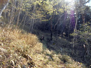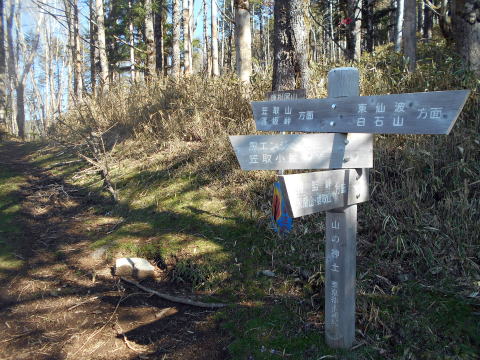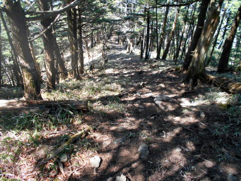 10:25−40 (多分)黒槐ノ頭を少し過ぎた辺りで小休止・パン ![]() 10:45 縦走路は黒槐山(くろえんじゅやま)を巻いてつけられている ![]() 10:59 緩やかな道が続く 11:05 水干分岐通過。 ![]() 笠取山へは道標に従いこの標識裏手の道を行く ![]()