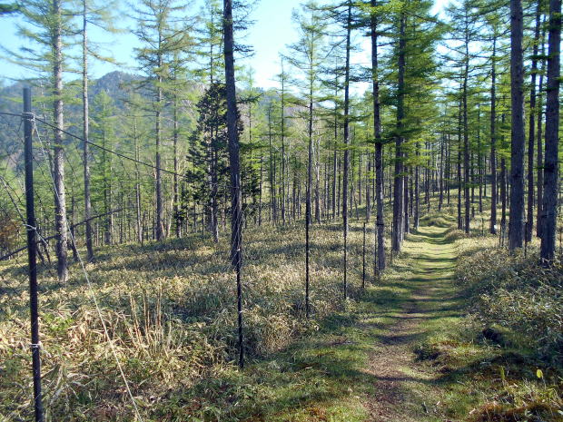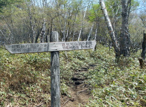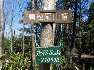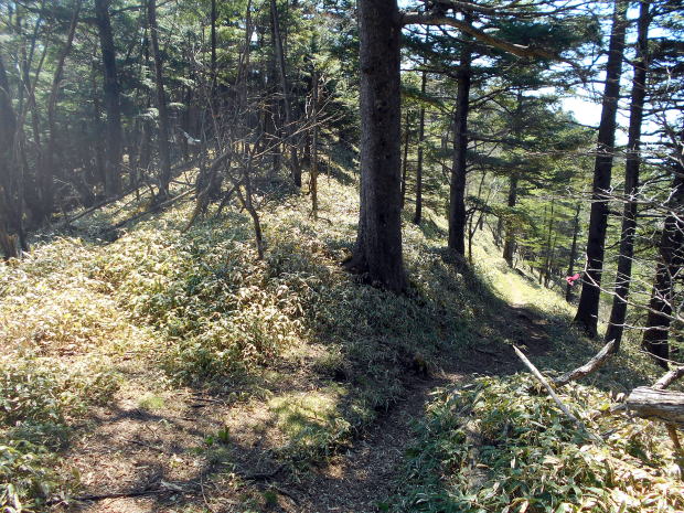 9:24 左からの縦走路と合流。西御殿岩からは、この道で大正解(^^)v ![]() 合流点を振り返る。右のピンクテープが縦走路。 左手来た道には薄い踏み跡。 ![]() 9:30 緩やかな道が続く ![]() 9:36 縦走路を右へわずかに逸れると唐松尾山の山頂だ 9:37-39 唐松尾山(2109.3m)通過。山頂は樹林に囲まれ展望なし。