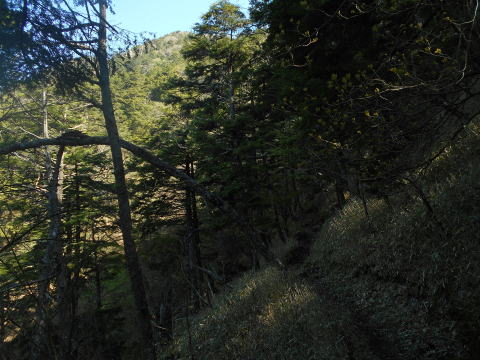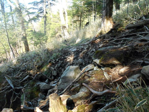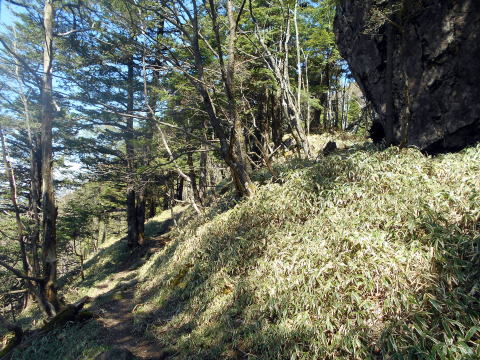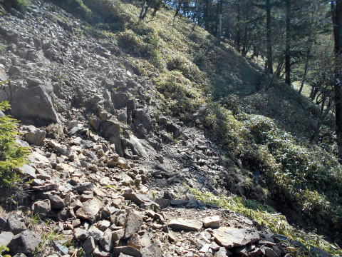 西御殿岩への道は緩やかで、トラバース状についている。 ![]() 8:40 ガレ場通過。 ![]() 8:41 樹間より望む大菩薩嶺と富士山♪(ズームで撮影)