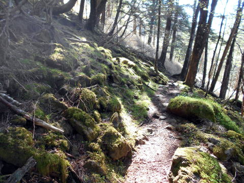 7:55−8:10 山ノ神土分岐(小休止・パン) ![]() ここからは初めて歩く道。奥秩父主脈縦走路だ。 樹間からは左手に富士山が見えた♪ ![]() 緩やかな道を行く。 ![]() ![]() 8:15 ガレ場通過 ![]() 8:19 苔の美しい森を振り返る 8:35 西御殿岩分岐通過。縦走路から逸れ、地図によると往復35分とある。