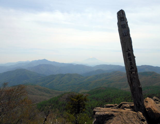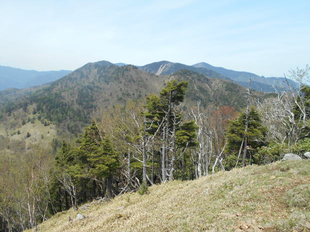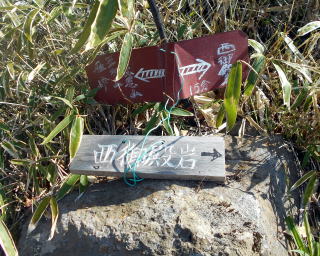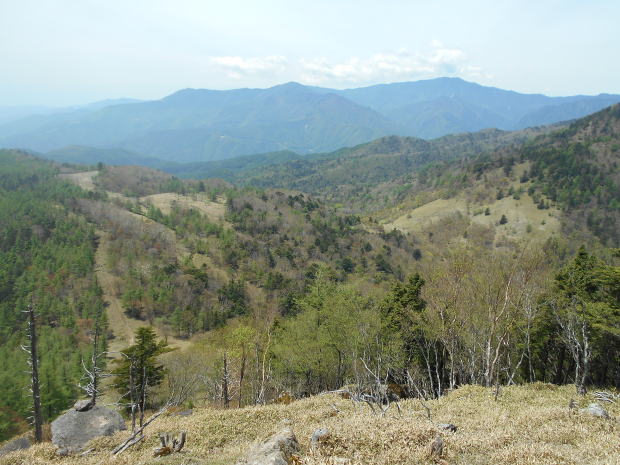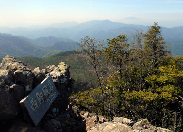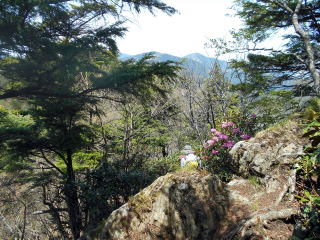 ![]() やや急な岩場を登ると西御殿岩だ。 8:50−9:00 西御殿岩(2075m) 小休止。う・わ〜っつ!!大展望\(^o^)/\(^o^)/ 春霞でスッキリ見えるとはいかないが、無風&快晴で大満足♪ ![]() 大菩薩嶺と富士山 ![]() 北側には和名倉山 ![]() 東側・雲取山方面 コンデジなので上手く撮影できなかったが、肉眼では国師ヶ岳の後方に雪をいただく 南アルプスも見えた♪ ![]() 西御殿岩より望む国師ヶ岳(中央左奥)、これから向かう唐松尾山(手前正面) ![]() 9:05 来た道を戻るつもりでいたが、右手に往きには気付かなかった踏み跡発見! ピンクテープが巻かれているが地図にはない道で、踏み跡の先へ続くピークだけの道かも しれないということで、ちー隊長が先へ進み確認後、稜線通しに踏み跡が続いているので、 方向的にも辿れば元より先・唐松尾山寄りの縦走路に合流するであろうことを確信し進む。 ![]() 地図にはなない道地点。 左の道が本来の道。右手の薄い踏み跡を登る 5分ほど急登を行くと、石楠花の群落をかき分けた先にピークがあった。