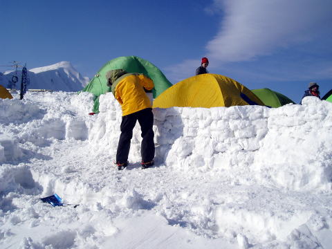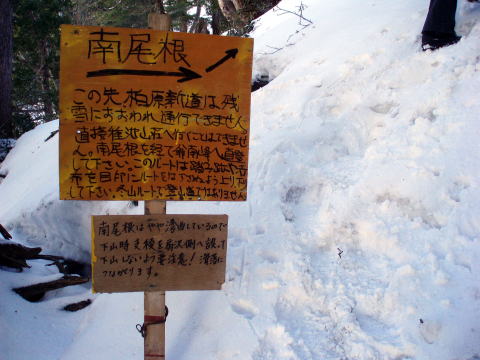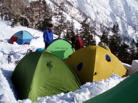 柏原新道登山口 6:45〜7:45南尾根分岐〜10:30 ジャンクションピーク 10:45〜 12:30 爺ヶ岳南峰 12:40〜14:35 冷池山荘テン場(泊) 6:15 登山口駐車場着。昨日の天気予報が悪かったことと、今年は山小屋の事情で この時点では、冷池山荘素泊り営業のみだったせいか、駐車場は空いている。 6:45 身支度を整え、柏原新道登山口出発。 残雪に覆われているものの、始めは夏道を行く。 ![]() 柏原新道登山口 秋以来のテン泊&雪山装備なので、一泊といえども荷が重く感じられる(^^; 最近購入したストックの扱いに慣れるため持参したが、歩き始めたそばから両手 に落ち着きが悪く、バランスが取り辛い。不慣れなために腕もとっても疲れる(^^; よっちゃんのアドバイスで、とりあえず一本だけ使うことにする。 ![]() 八ツ見ベンチ付近より望む扇沢バスターミナル(中央下) 7:45 南尾根分岐通過 ![]() これより案内板の通り、冬山ルートを行く。トレースもしっかりついている。 7:50−8:00 小休止 一本使いのストックはやはり使い辛い。よってザックの荷を増やすことに(^^; 小休止を終え、樹林帯の道を淡々と行く。 ハイジの登り歩行スタイルは、両腕を組む、または、腰に両手を当てるのだ。 (ピッケルを持っている場合は片手腰スタイル) よっちゃんからは、『昔ながらの歩荷スタイルですね〜♪』と言われた(^^) 8:45−9:00 小休止 9:45−10:00 行動食のパンを食べる。これよりジャンクションピークまで傾斜が 増すとのことで、念のためアイゼンを装着し出発。 10分ほど行くと、樹間のちょっとしたスペースの所々にテントが設営されていた。 どうやらテン泊ポイントになっているようだ。 10:30 ジャンクションピーク着(小休止) やっと爺ヶ岳南尾根稜線上に出た。 ↓爺ヶ岳南峰 ↓爺ヶ岳中峰 ![]() ジャンクションピークより望む 真っ青な空と白く輝く峰々が、視界いっぱいに広がる♪ 10:45 絶景攻め第一弾を楽しみ出発(^^) 11:20 爺ヶ岳南峰に取り付く手前の平らなところで大休止。(おにぎり&パン) ![]() 爺ヶ岳南峰を望む ↓前穂↓槍 ↓蓮華岳 ![]() ↑ジャンクションピーク(中央左) ↓剱岳 ↓種池山荘 ![]() 11:40 絶景攻め第二弾を楽しみ出発(^^) アイゼンを装着しているのでなるべく雪のある所を歩きたいが、雪が緩んでおりズボ の恐れもあるので、中腹あたりは岩道を行く。 12:10−15 小休止。もう少しで南峰だ。 12:30 爺ヶ岳南峰着。風が強いが360°大展望!! ↓蓮華岳 ↓針の木岳 ![]() ↓立山 ↓剱岳 ![]() ↑種池山荘(中央) ![]() 爺ヶ岳南峰より望む鹿島槍ヶ岳 ↓焼山 ↓火打山 ↓妙高山 ↓高妻山 ![]() ↑爺ヶ岳中峰(左ピーク) ↓富士山 ↓南アルプス連峰 ![]() 爺ヶ岳南峰より望む 12:40 絶景攻め第三弾を楽しみ出発(^^) 風が強いので、中峰に登り返さず、巻き道を行く。(これよりピッケルを持つ) ![]() ![]() 北峰直下の巻き道は、黒部側の谷に落ちないよう、特に慎重に進む。 ↓剱岳 ↓毛勝三山 ![]() 14:00−20 小休止。もう一息で冷池山荘だ。 ![]() ↑雪庇の奥赤い屋根(冷池山荘) 14:35 冷池山荘着。 ひーちゃんと共に、小屋の受付へ。 (テン場代1人/¥500、水1L/¥150、トイレは山荘内を使用) 狭いスペースのテン場は大賑わい。 よっちゃん&ちー隊長に良い場所を確保してもらい、3〜4人テント(豪邸??)×2張 設営するため、斜面を削り整えてもらう。 ![]() ↑よっちゃんテント ↑我が家 ひーちゃんとハイジは、敷地へ続く道作り(^^) 山荘へ続く道を踏み固める。 リーダーよっちゃんは、防風壁作りに余念がない。スコップでブロック状に切り出した 雪を、丁寧に積み上げて行く。途中まではちー隊長がアシスタントをしていたのだが、 五段目?以降は、よっちゃんの拘り職人技で、作品を仕上げていただいた(^^) ![]() 防風壁作り職人と化すよっちゃん なぜ、よっちゃんがこの作業にこだわるのかといえば、今度の海外遠征(6月)・ マッキンリーを控えているからなのだ。 お話によれば、現地で毎回この作業をするそうなのだ。 ![]() 完成♪ 見事な職人技! 17:00 【うわばみタイム♪】 焼鳥缶詰、 ちーかま、 かりかり梅、 きゅーちゃん。 夕食と宴会もご一緒したいところだが、風が強く寒いので、各自のテントで済ませる ことに。よっちゃん御夫妻は、山は強いもののアルコールには弱いのだ〜(^^) 18:15 夕食・スパ王(ミートソース) ![]() 夕映えの爺ヶ岳 ![]() 夕暮れの剱岳 19:40 消灯&爆睡zzz |