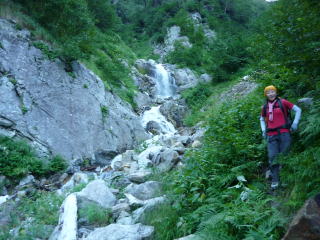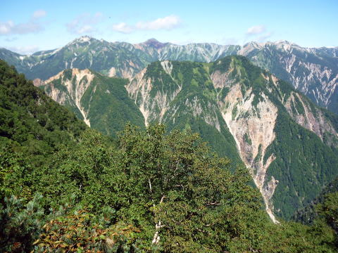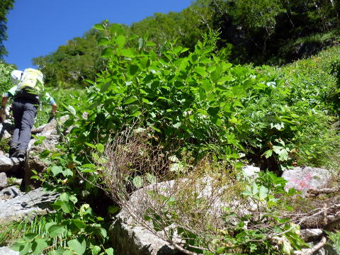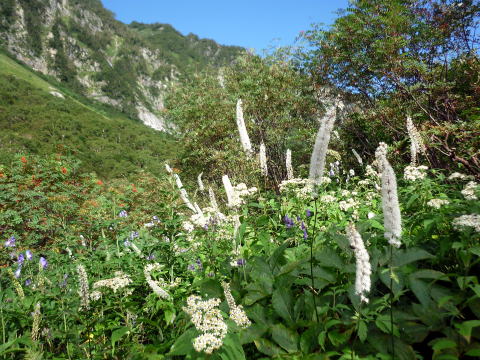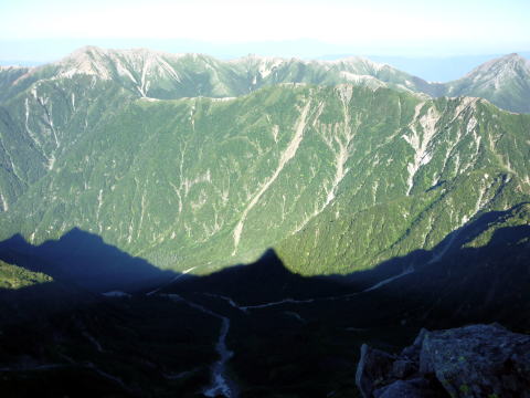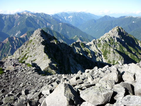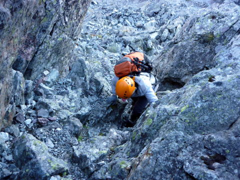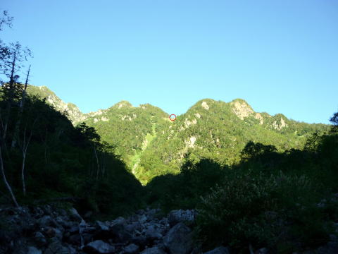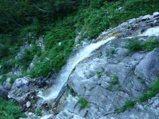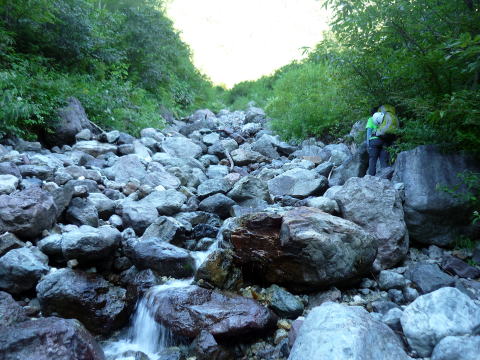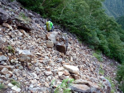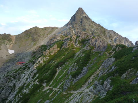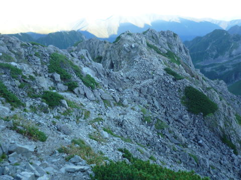 大天井ヒュッテ 4:30〜7:15 北鎌沢出合 7:30〜10:00 北鎌のコル 10:20〜12:35 独標 12:45〜15:25 北鎌平 15:45〜16:40 槍ヶ岳 16:50〜17:50 ヒュッテ大槍(泊) 4:00 起床。下界の猛暑と大違いで肌寒い。(後日大天井ヒュッテのブログにて、初氷が張った ことを知った) 朝食はとらず、行動食とする。 4:30 ヘッドランプを点け出発。 本日小屋から北鎌へは、我らがトップで出発だ。 といっても、昨夜夕食時にお話したガイドパーティ(2人)も、数分違わず出発されるので、途中 で抜かれてしまうだろう(^^; 暗いので、貧乏沢下降点を見逃さないよう、慎重に歩く。 4:50 貧乏沢下降点通過。 ネットで見た木の標識(板)を確認し、縦走路から逸れ一段上がり下降点へ。 天上沢出合まで、標高差770mの下りだ。 いきなりハイマツの藪をこぎ、貧乏沢の下りは始まる。 少しの間で藪を抜けると、急傾斜のガレ場だ。ガイドブックやネットの記事通り浮石だらけ。 殆ど全部浮いていると言っても過言でない位(^^; 落石を起こさぬよう、慎重に慎重に足を運ぶ。 5:20−25 小休止。(ウィダーインゼリー) だんだんと明るくなり、裏銀座の山々を朝陽が照らす。 休憩を終え出発する頃、ガイドパーティ到着。 ![]() 二人で山行の場合、一般登山道ではハイジが先に歩き、ちー隊長が私に合わせてくれるスタ イルだが、今山行は、ルートファインディングは全面的にちー隊長にお任せなので、ハイジは 自分の歩きに注意を払い、ちー隊長のルート取りを見ながら(漠然とついて行くのではなく)、 可能なかぎり勉強させてもらうのだ。 ![]() ルートは、ガレ場の下りをずっと行くのではなく、時折左岸の樹林帯に取る。 樹林の中に薄い踏み跡があるが、倒木も多く、鬱蒼としており、一人では歩きたくない道だ。 ![]() 6:05 右岸から立派な滝が現る。これが貧乏沢で半分位の地点に当たる、目印の滝なのだ。