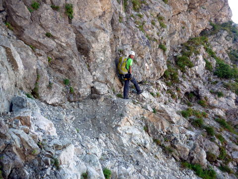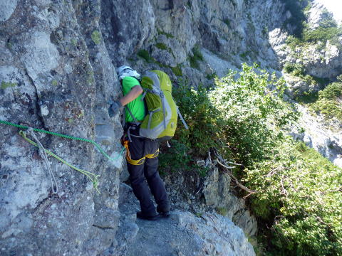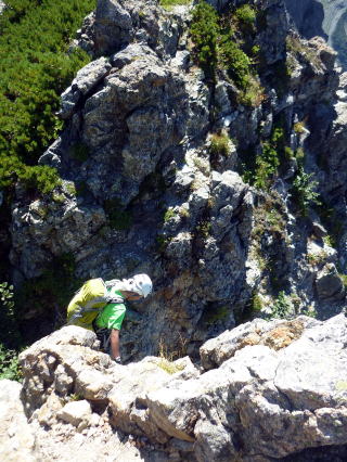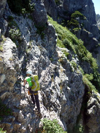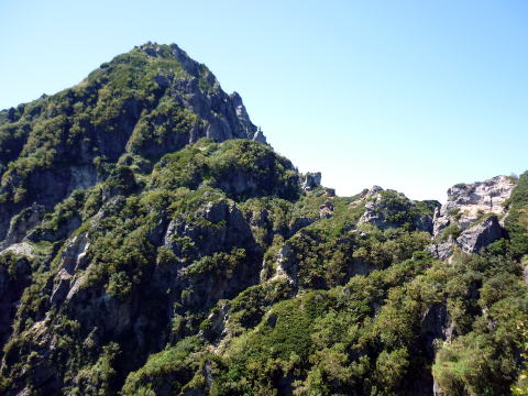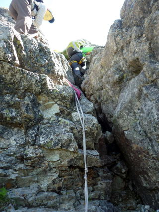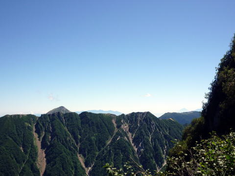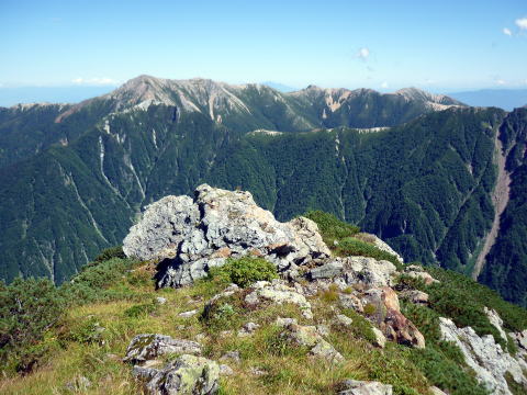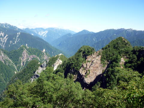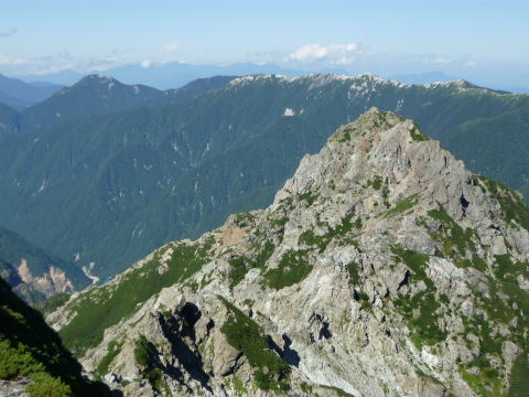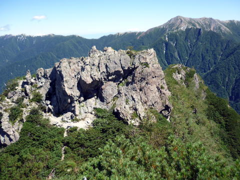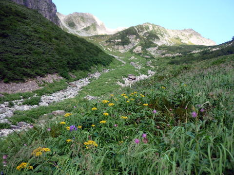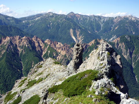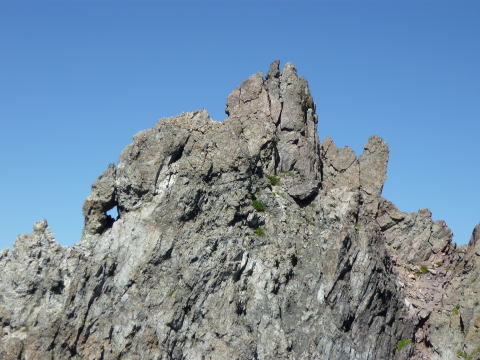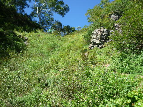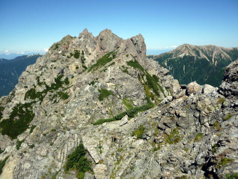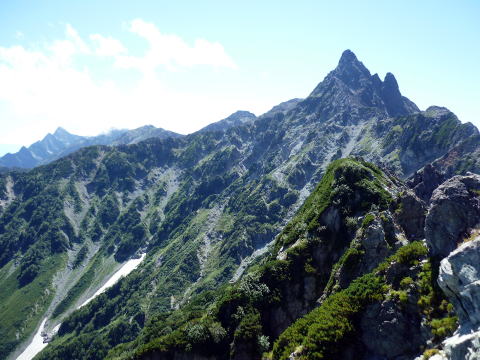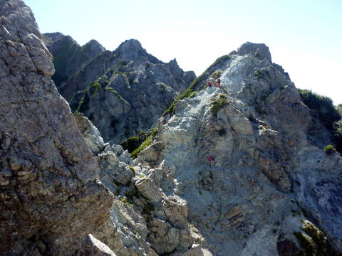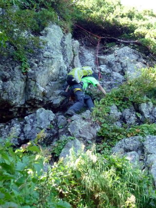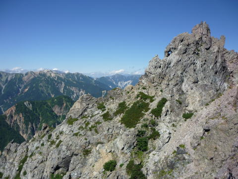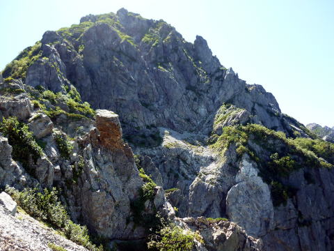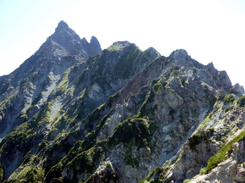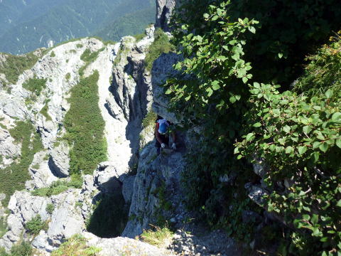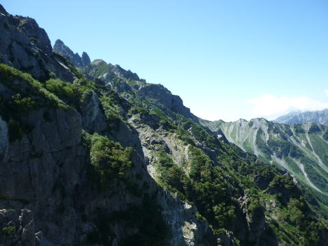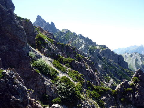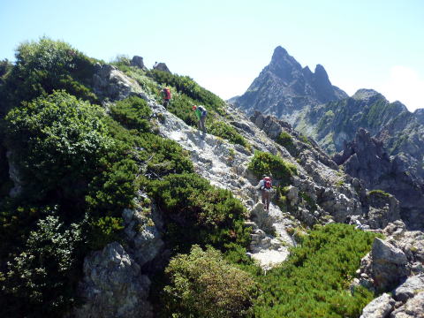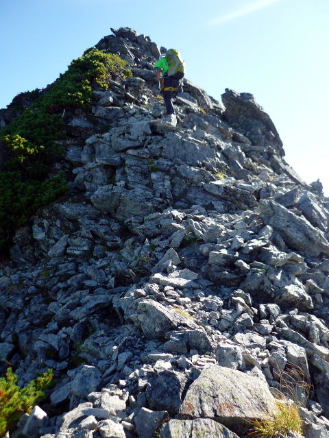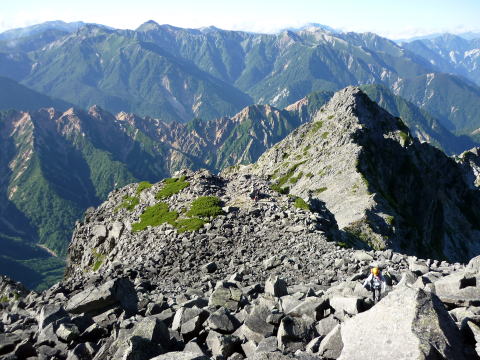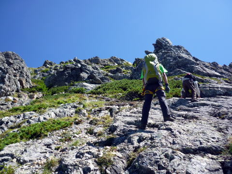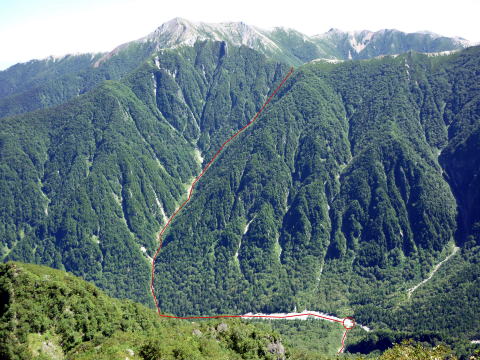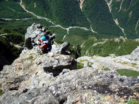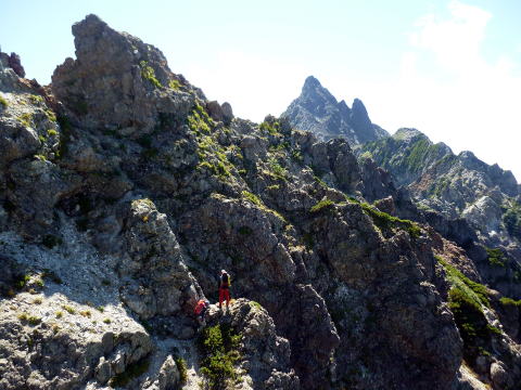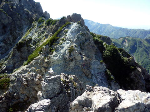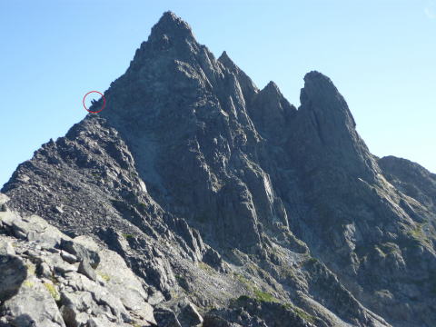 斜度が緩み、今までよりは歩きやすくなってきた。 天上沢出合までの間一箇所、滑りやすい段差の大きな岩に、緑色のロープが架けられていたが、 使わずとも大丈夫だった。 6:55 天上沢出合通過。とりあえず、核心部第一の貧乏沢クリアだ(^^) ![]() 天上沢より水俣乗越方面を望む 北鎌沢出合に近づくにつれ、テン場になりそうな所が、また張った跡がいくつか現れる。 7:15−30 北鎌沢出合(大休止・パン) 夏から秋、季節が入れ替わったようで、汗もかかず、日陰ではじっとしていると寒い。 ちー隊長3L、ハイジ2L、プラティパスに水を満たす。(他にポカリ1L) 貧乏沢の途中で抜かれてしまうとばかり思っていたガイドパーティさん達とは、意外なことに 出発時にもお会いしなかった。 ![]() 北鎌沢出合より望む北鎌のコル方面(中央赤丸印) 北鎌沢から北鎌のコルまでは、標高差640m登り返す。登り返しは辛いが、ガレ場の下降より はマシかなぁ〜(^^; ![]() 北鎌沢 7:45 左側に水量豊富な沢が現る。これが左俣だ。 ルートは涸れ沢状の右俣へ。間違えようのないほど明確だ。 8:20−25 (この時の)最後の水場で小休止。 ![]() 水場から来た道を振り返る 8:55−9:00 小休止・パン ![]() 斜面はやがて涸れ沢状から草付きになり、傾斜もより増してきた。 途中一箇所、ハイジは全く気付かなかったが、ちー隊長が右側に水の滴る岩を見つけ、念の ため、草をかき分け行ってみたところ、涸れ沢状に上部へ続いていたということだった。 歩きにくそうだということで、元に戻り、左側の比較的踏み跡が明瞭な草付きを行く。 10分ほど進み、ちー隊長が右へトラバースしている薄い踏み跡を見つけ、また、念のため辿っ てみたところ、先ほど下方で見た涸れ沢状の延長になっていたようだが、ハイジの待つ元の 場所に戻る。まだ稜線はハッキリ見えないものの、このまま直上するルートが大きく間違って いるとも思えず、草付きを進む。 草付きは急斜面で、殆どアキレス腱伸びっぱなし状態(^^; 斜面が脆く、両手で草を掴み登ろ うにも草も細く弱くあてに出来ずだ。滑らぬよう、慎重に一歩一歩、なんとかここを突破するしか ない(^^;; 黙々と登る。(本当はゼイゼイハアハアしながら) 斜度が緩み、稜線が見えてきてホッとする。 枯れてはいるが、周囲はお花畑だったようだ。 右手に道が現れたので、そこを辿り、ちー隊長の待つコルへ。 ![]() 一足先にコルに着いたちー隊長を見上げる(わかるかなぁ〜) 10:00−20 北鎌のコル(大休止・パン) 正確には、北鎌のコルより少し先、ヤセ尾根の基部あたり。1張り程のテントスペースあり。 ↓P7 ![]() ヤセ尾根の基部から北鎌のコル方面を望む(コルは見えない) コルから来た道を見下ろす。北鎌沢出合が見え、降りてきた貧乏沢も見える。う・わ〜っ!! ↓大天井岳 ↓赤線部が貧乏沢 ↑赤丸部が北鎌沢出合 ここまでで、時間的にも体力的にも、本日の行程半分くらい(^^; 自分なりにシミュレーションしていたのと同じくらいの所要時間なので順調だ。 長めに休憩し、【ここからスタートするのだ】と、気持ちを切り替える。 ハーネスとヘルメットを装着し、これからの尾根歩きにワクワク♪ 休憩を終える少し前に、私達と同じ草付きの斜面から単独の男性現る。 挨拶を交わし、お話をする。 仮称A氏は、北鎌尾根は5年ぶり3度目で、コルを目指したがやはりこちらへ来てしまった とのこと。今朝ヒュッテで朝食を済ませ出発し、ここまでで2組抜いて来られたそうだ。 三度目の今日は、写真を撮ることが目的なので、北鎌尾根をゆっくり楽しみたいとのこと。 なので、私達は一足お先に出発する。 ヤセ尾根は、木の根を掴んだりしながら登るほど急ではあるが、普通の登山道のようにしっ かりした道であった。 ひと登りで視界が開け、いい眺め〜♪ ↓鷲羽岳 ↓水晶岳 ↓野口五郎岳 ![]() ↓針ノ木岳 ↓唐沢岳 ↓燕岳 ![]() ↑P6 振り返ると、先ほど休憩したコルに、ガイドさんパーティ2人の姿が見えた。 ハイジが手を振ると、仮称C子さんも応えて下さり、手を振り返してくださった(^o^)/ 景色に見とれているわけには行かないので先へ。 天狗の頭手前の急な部分に、残置ロープがあったが使わずに行く。岩やハイマツを掴みな がら登る。 ![]() 天狗の頭からもいい眺め〜♪ 今朝辿ってきた貧乏沢と天上沢、北鎌沢出合までバッチリ見える!! ↓大天井岳 ![]() 赤線部が辿ってきたところ 行く手には、う・わ〜〜っ、独標だ〜 \(^o^)/ ↓独標(2899m) ![]() 11:10 天狗の腰掛通過。 ![]() 天狗の腰掛を振り返る 間もなく、独標方面から大きな落石の音と共に、人の声がしてビックリ! よく見ると、直登ルートを攀じる2人組パーティだった。 独標の基部が近づいたあたりで、初めて【槍】が見えた♪ ↓槍ヶ岳(3180m) ![]() ![]() 独標基部手前 ↓独標 ![]() 11:40−50 独標基部・トラバース道手前(小休止・パン) この辺りや天狗の腰掛付近に、テントスペースあり。 ![]() 基部で休憩中、A氏が追いついて来られたとばかり思っていたが、仮称B氏であっ