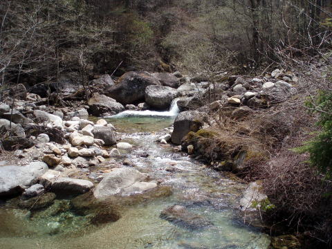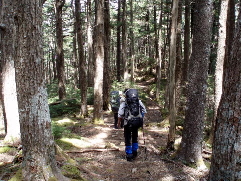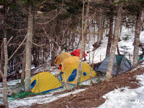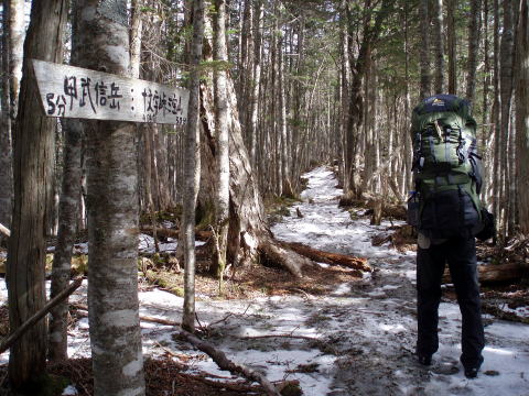 毛木平P 10:30〜13:30 千曲川水源地標 13:40〜14:30 甲武信岳 14:50〜 15:05 甲武信小屋(テント泊) 10:10 毛木平P着(トイレ有り)。広めの駐車場には車が数台。中途半端な季節の ためか空いていた。 10:30 身支度を整え出発。 ![]() 新緑の中、緩やかな道を行く。 ![]() 11:30−40 休憩 12:25−40 休憩 水源地手前20〜30分あたりより残雪の道となる。下りの登山者は軽アイゼンを着け ていたが、我らはそのまま進む。 13:30−40 千曲川信濃川水源地標着。休憩。 ![]() 水源地標から急坂の道となる。残雪量も増え、ズボってしまわないよう一歩一歩 慎重に行く。軽アイゼンを持参したが着けずに進む。 14:05 奥秩父主脈稜線分岐通過。 ↓金峰山 ![]() 甲武信岳直下の急登(奥:ちー隊長、手前:S氏) 14:30−50 甲武信岳山頂着。休憩。(肉眼では富士山がうっすらと見えた) ![]() 山頂から甲武信小屋へ向けて下る。日陰&残雪の登山道は凍結箇所もあり慎重 に歩を進める。 15:05 甲武信小屋着。(テン場代:一人¥300)水場は雪のため利用できず、小屋 にて(1L/¥50)調達する。 ![]() 甲武信小屋 テン場は高校生のパーティーで賑わっていた。 ![]() ↑S氏のテント ↑我が家 16:00 酒盛り開始♪ 19:30 消灯。 |