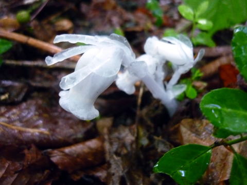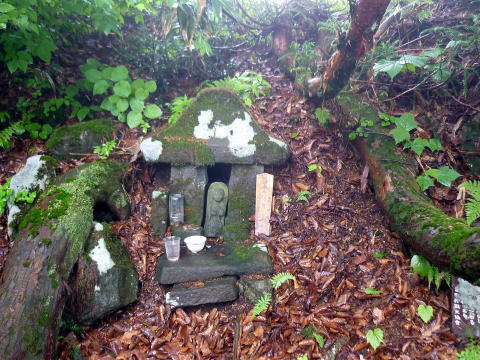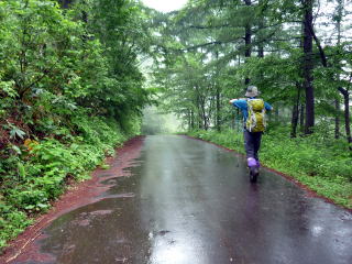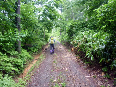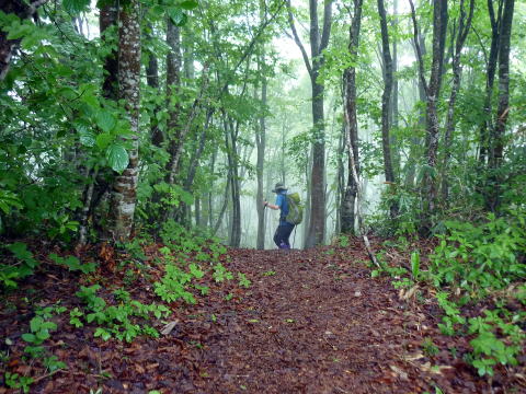 まだらおの湯第2P 5:55〜7:25 斑尾山 7:40〜8:30 まだらおの湯第2P 5:10 道の駅・ふるさと豊田出発。 5:25 まだらおの湯第2P着。(雨脚が弱まるまで待機) 5:55 小雨の中、駐車場出発。今の所、登山者は我らのみ。 赤矢印辺りが登山口方向。 トイレは車の後方部・施設の端 ![]() 第2駐車場より望む まだらおの湯 ![]() ![]() アスレチック広場の右脇の林道を行く ※赤矢印参照 パターゴルフ場の中を通り、施設を抜ける。 ![]() 標柱の案内に沿って、林道を右折する ![]() 別荘地の中?の林道 6:15 山頂へ2.2km標柱通過。 林道を横切る。 6:25 車道分岐通過。ここが地図のポイント区間(登り)40分の地点かと思われる。 ![]() 道標には従わず、林道を横切り目の前の明瞭な登山道を登る。※復路で検証したところ、 道標通りに車道を歩くほうが時間短縮だった(^^; 6:35 車道と合流し、やっと本格的な登山道となる。 ![]() ここから山道の始まり〜(^^) ![]() やや急な直登の杉林を行く ![]() 林相が変わると斜度が緩む ![]() ギンリョウソウ 7:15 尾根に出ると、更に緩やかな道が山頂まで続く。 7:25−40 斑尾山(1382m) 大休止・バナナ。誰もいない山頂だ! ![]() 山頂は樹林に囲まれ展望無し ![]() 雨のため展望は得られないので、大明神岳へは寄らずに下山する。 ![]() 山頂から僅かに(大明神岳側)逸れてある、十三薬師 ![]() 7:50 尾根から離れ、少しだけ急降下 8:10 山道を終え、車道出合い通過。