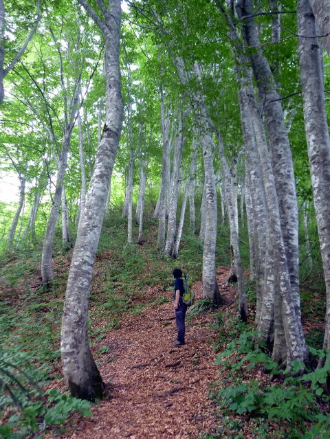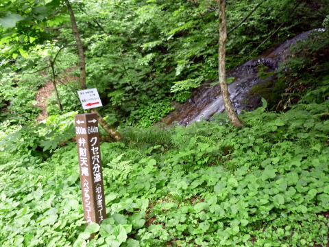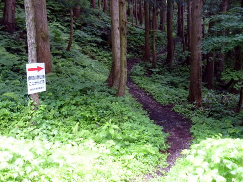 越沢登山口P 5:55〜7:30 避難小屋 7:35〜8:15 摩耶山 8:30〜9:55 越沢登山口P 4:45 道の駅・月山出発。 ![]() 国道345号沿いにある越沢登山口案内板 5:40 越沢登山口P着。(トイレ&水場なし) 5:55 駐車場出発。 ![]() 登山道入口 薄暗い杉林の緩やかな道を行く。雑木林に変わると沢を渡りる。 ![]() 小浜の茶屋跡までは緩やかな道だ 6:15 小浜の茶屋跡通過。 小雨がパラつき、いつ本降りになってもおかしくない空模様なので、滝コースを避け 尾根コースを往復する。 ![]() 小浜の茶屋跡 ここからは良く踏まれた歩きやすい登山道らしくなる。 6:50−55 クセ穴大森林分岐(小休止・オレンジジュース) ![]() クセ穴大森林分岐 ![]() ブナ林は、足にやさしいフカフカの道♪ 7:20 追分分岐通過 ![]() 追分分岐(関川コース合流点) 追分分岐からは斜度が緩む。