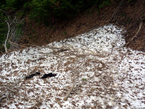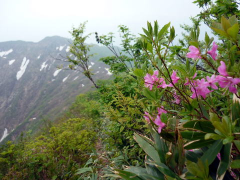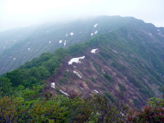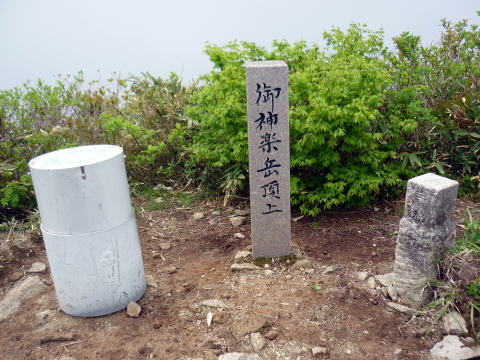 福島県側金山町主催の山開き行事としては、本名御神楽〜御神楽岳間は推奨していない。 ネットでの過去記事や、当日役場の方の説明では、藪こぎということであった。 山開き予定表では、11:30本名御神楽着、13:30本名御神楽出発(下山)とあり、その2時間 を利用し、行く人は自己責任で、コースタイムで40分とある御神楽岳を目指す。 緩やかな尾根道は、予想に反して藪こぎという箇所はなく、片側切れ落ちている箇所があり 歩きにくい部分もあるが、狭いながらも普通の登山道といったかんじだ。 ![]() 新潟県側・水晶尾根方面のスラブ 11:00−05 御神楽岳(小休止) 新潟県側から来た人も加わり賑わっている。 時間的には余裕があるが、ガスっている山頂は展望良くなく、虫攻撃も凄いので早々に 下山する。 ![]() 御神楽岳(1386.5m) 帰路は、往きに撮れなかった花の写真を撮りながら行く。 ↓本名御神楽 ![]() チゴユリやカタクリも見られたが、撮影失敗(^^;