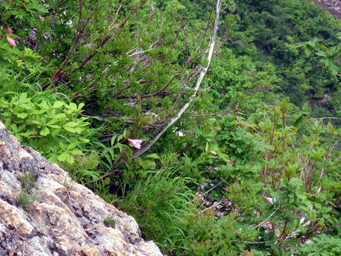 11:30 本名御神楽通過。山頂は、相変わらず人だらけ。 11:40 避難小屋通過。 登ってくる人がまだ結構いる。 鎖場では渋滞にハマる。 ![]() 鎖場より望む熊打場方面 鎖場を下りきった所の左側斜面に、ヒメサユリ発見♪♪ 過開花まであと少しのヒメサユリ 11:50 熊打場通過。