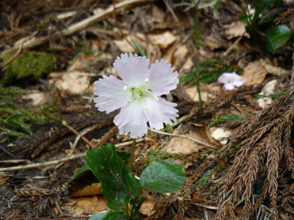 霧来沢登山口 7:50〜11:00 御神楽岳 11:05〜13:30 霧来沢登山口。 7:00 役場駐車場出発。この日は5台のバスにて登山口へ。 7:30 登山口着。(この日だけ?仮設トイレ3つあり) 7:50 山開き神事を済ませ、皆で連なり登山口出発。 林道を10分ほど行くと、登山口の標識現る。標識周辺に4〜5台駐車できそうだ。 ![]() 霧来沢登山口(帰路撮影) 平坦な道を行く。八乙女滝を過ぎ、滝を高巻く鎖場が現れ渋滞(^^; ![]() 美しい滑底の霧来沢の脇を過ぎ、雪渓を2箇所越える。 ![]() 9:05−10 尾根取り付き付近(小休止・オレンジジュース) ここから杉山ヶ崎まで急坂が続く。登山者が大分バラけてきた。 我らは第二グループ?あたり。 9:35 杉山ヶ崎通過。熊打場まで緩やかな道。 ![]() 9:55−10:00 熊打場(小休止・オレンジジュース) この先の鎖場渋滞が見える。 ![]() ![]() コイワカガミ 10:10 避難小屋通過。 ![]() 10:30 本名御神楽通過。狭い山頂は先行した登山者でいっぱい! 山頂標柱だけ写真を取り御神楽岳へ。