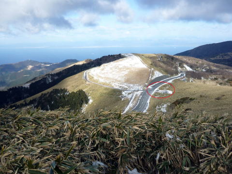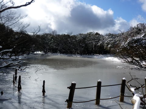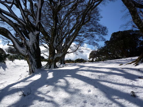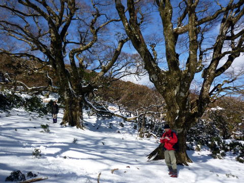 仁科峠 8:45〜10:00 猫越岳 10:05〜13:40 二本杉峠(旧天城峠) 14:35〜 15:30 大川端キャンプ場跡地 8:35 宿からタクシーにて仁科峠到着。風の通過場所となっており寒い!! ※仁科峠には、トイレ&水場なしなので注意。 8:45 仁科峠(895m)出発。 ![]() 仁科峠駐車場広場 笹原につけられた緩やかな道は、積雪10cm前後で歩きやすい。凍結箇所もなく、持参の 軽アイゼンは付けずに進む。 寒風に耐え、ひと登りでいい眺め♪ 雲に隠れ気味だが、主稜線の彼方に富士山だ(^^) ![]() 赤丸囲み部が仁科峠 ↓富士山 ![]() ![]() 天城の山らしいアセビのトンネル 9:10 後藤山994m通過。 9:35−40 後藤峠展望台(小休止) 登山道から少し逸れたところある。眼下には海が一望だ(^^)v ![]() 後藤峠展望台より望む猫越岳 道標に従い、火口湖へ寄る。 9:45−50 火口湖(小休止) ![]() 全面凍結していた猫越火口湖 10:00−05 伊豆山稜線最高峰・猫越岳1035m(小休止) ![]() 標識がなければわからない猫越岳山頂(^^; 10:25−35 猫越峠970m(小休止・行動食) 猫越峠を過ぎ10分程で↓標識が現る。 ![]() 巨木エリア目印標識 この標識を過ぎて50mほど先、登山道を逸れ右へ行くと、宿の御主人に教わった巨木 エリアだ♪ 10:45 ブナの巨木エリア(大休止) ブナの巨木が点在するそこは、降り注いだ陽が雪面に反射されてキラキラと美しく、 陽だまりに憩う木々たちの風情を一層引き立たせるところだった(^^) メンバー皆、それぞれに根元に立ち、木々に見入る♪ ![]() ![]() ![]() ↑ちー隊長が立っているブナの枝は、写真に収まりきらない長さ18mもある! ![]() 木の陰もイイカンジ〜♪(^^) ![]() 木の洞の中にも入っちゃいました〜♪↑ 11:00 本道へ戻り、先を目指す。所々ヒメシャラ林もある。 11:45−12:10 つげ峠960m(昼食・カップヌードル) ![]() つげ峠の道標 12:35 三蓋山(1013m)通過。 ![]() 三蓋山を過ぎ、滑沢峠への下りは、今回コース中唯一の急勾配だ。木の階段に雪が 着いており慎重に下る。 13:05−10 滑沢峠850m(小休止) 滑沢峠から二本杉峠までは、ほぼ水平道だ。積雪も殆どない。 13:40−14:35 二本杉峠820m(旧天城峠) 大大大休止。 ここから天城峠バス停までの道は、崩落による通行止めだ。(案内板あり) よって、下山地を大川端キャンプ場跡地へ変更する。 一部凍結ぎみの箇所があり、メンバー数名は軽アイゼンを装着したが、それもつかの間 で、下るにつれ雪もない乾いた路面になった。林道に出合うとまもなくキャンプ場跡地へ 着いた。 15:30 大川端キャンプ場跡地着。 携帯でジャンボタクシーを呼び、修善寺駅へ。 |