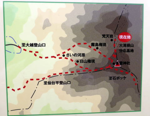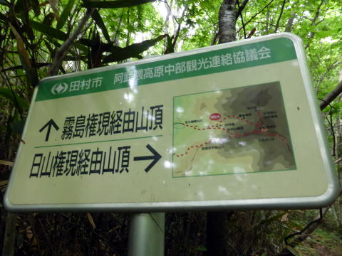 来た道を戻り、鳥居を潜り右へ行くと、大滝根山風景林の標柱と小広場だ。 この先にある梵天岩へは、曇っており遠景が望めないので寄らなかった。 ![]() 14:40 山頂出発。 予定では(下画像参照)、下山路は日山権現経由で駐車場へ戻るつもりだった。 がぁ・・・(^^; この後、まさかの標識見逃し??。 ![]() ![]() 下山時、はじめは刈り払われた平坦な道 ![]() 14:43 この分岐までは問題なし 標識に従い右へ行ったまでは良かったが、その後、更に現るハズの右への分岐を見逃 して??、歩きやすい尾根道に気を良くし、道なりに進んでしまった。 山行時はいつも、地図表記分岐では必ずログをとっているにもかかわらず(^^;; 全く気付かなかったので、二人共キツネに抓まれた気分。我らの目はフシアナか(××;) ![]() 14:55 鎖場通過 ![]() 歩きやすい道が続く 15:10 五合目ブナ平通過。