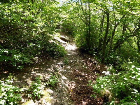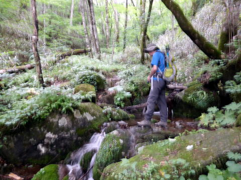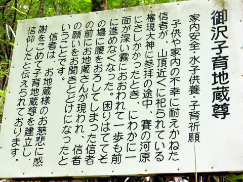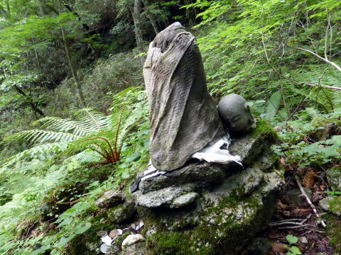 13:30 大滝登山口通過。ここで初めて案内板が現れホッとする(^^; ![]() 笠石を過ぎると間もなく分岐 ![]() 13:45 賽の河原分岐通過 (復路は周回し、ここへ戻るハズだった) 沢沿いながら蒸し暑く、薄暗くじめじめしており、独りでは歩きたくないなぁ〜と思うこと しきりのハイジであ〜る(^^; 当然ながら虫もしつこく寄ってくる(^^;; ![]() 小さな沢をいくつも渡る 14:10 御沢子育地蔵尊通過。 ![]() ![]() 痛々しい姿のお地蔵様(^^; 沢を離れ、ここから一気にロープの架かる急登だ。