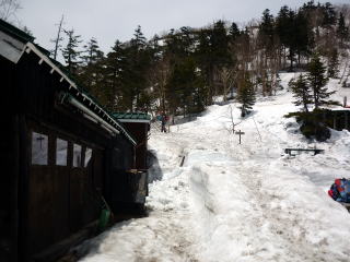 中房温泉第1P 9:00〜11:40 合戦小屋 11:50〜12:50 燕山荘 13:40〜燕岳往復 〜14:35 燕山荘(テント泊) 4:30 自宅を出発。 8:40 中房温泉第1P着。(簡易トイレあり) 駐車場は9割方埋まっていた。 9:00 中房温泉第1P出発。 9:05 中房温泉登山口通過。(トイレ&水場あり) 駐車場からの緩やかな舗装路を頑張ってしまったためか、登山道に入ったとたんに足取り 重く、ザックも重く感じる(^^; 一週開いてしまったとはいえ、鳳凰の時とは大違いの体感 だ。後方に小屋泊の中高年パーティが続いていらしているせいもあり、気が急いてしまう。 9:40 ゼイゼイしつつ、第1ベンチ通過。 10:00−05 第2ベンチ(小休止・オレンジジュース) ひと汗かいたおかげで、体がスッキリしてきた(^^)v 前後に登山者も見えず、マイペースで快適歩行♪ 10:35 第3ベンチ通過。 10分ほどで残雪現る。雪は緩んでおり、つぼ足のまま行く。 間もなく、前方の団体さんに追いついてしまう。 今日明日と、燕山荘主催の初心者春山教室のメンバーかと思われる。 最後尾のスタッフに、お先に行かれますか?と言われたが、16人パーティときき、抜く気 が失せ、休憩するであろう富士見ベンチまで後方を歩かせていただく。 ゆっくりペースなのでとっても楽だ♪ 11:05−10 富士見ベンチ(小休止・オレンジジュース) 団体さんや先客者の休んでいる所を越え、一段上のスペースで休む。 合戦小屋に向けて淡々と行く。 ↓大天荘 ↓大天井岳 ![]() 合戦小屋手前で大天井岳が見えた♪ 11:40−50 合戦小屋(小休止・パン) トイレあり。 雪上のベンチには、多くの登山者が休憩中であった。