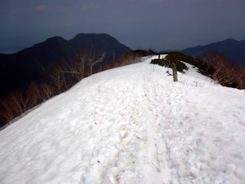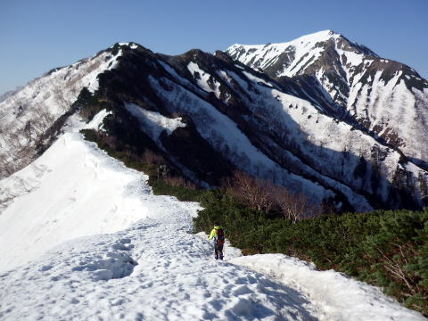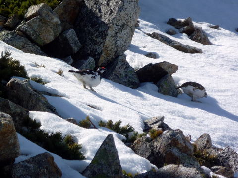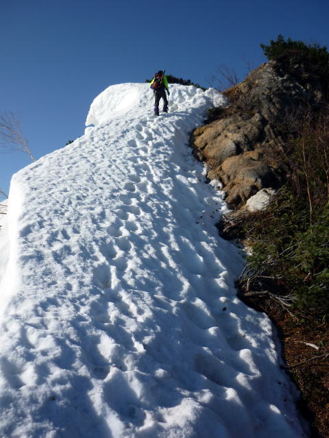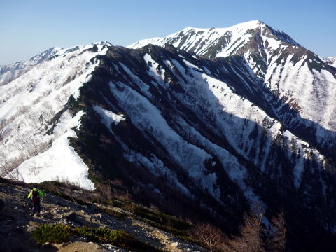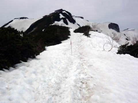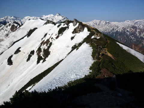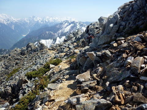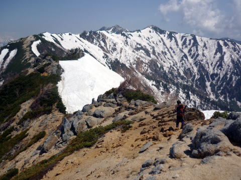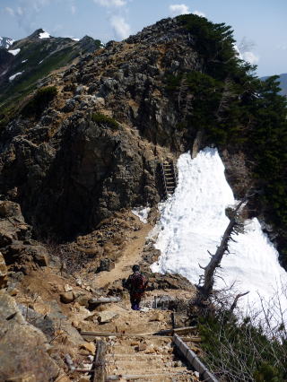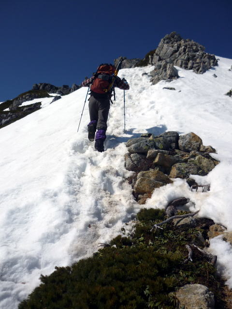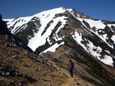 テン場 6:05〜8:40 大天井岳 8:55〜11:20 燕山荘(テント撤収) 12:05〜12:40 合戦小屋 12:50〜14:45 中房温泉第1P着。 5:00 起床。 5:20 朝食(パン&コーヒー) ![]() 5:55 テン場と燕岳 6:05 テン場出発。 ハイジのザックに二人分の日帰りセットを入れ、ちー隊長に背負ってもらいお姫様登山♪ ![]() ![]() 6:30 蛙岩通過。 ![]() 6:50 大下りの頭通過。 ↓大天井岳 ↓槍ヶ岳 ![]() 大下りの頭より望む ↓大天井岳 ![]() ![]() 大下りの頭最低鞍部手前から100m位雪上を歩く ![]() 7:10−15 登り返し最初のピーク(小休止・チョコ) ここから大天井岳までの間、残雪部は下画像赤丸部2ヶ所だ。 ![]() 喜作レリーフを通過し、トラバース状の残雪部を慎重に通る。 8:05−15 大天荘分岐(小休止・羊羹) これより山頂までは、ガレ場の直登ルートを行く。 8:25 木柱通過。 燕山荘からピストンした2人組とすれ違う。 ![]() 山頂手前の残雪部急斜面 ![]() 山頂直下で雷鳥ペアに遭遇〜♪ 8:40 大天井岳(2922m)着。大休止。う・わ〜っ!!360°丸見えだ〜〜\(^o^)/ 山頂には、燕山荘から蝶ヶ岳に向われるというオジサマが1人。 ![]() 北鎌尾根と槍ヶ岳 ↓双六岳 ↓鷲羽岳 ![]() ↓常念岳 ↓蝶ヶ岳 ![]() ↓赤丸部・燕山荘 ![]() 大天井岳より望む 8:55 大天井岳出発。 ↓針ノ木岳 ![]() 山頂直下のガレ場 ![]() 下りはより慎重に 9:05 木柱通過。 9:15 喜作レリーフ通過。 ![]() 鞍部が喜作レリーフ ↓燕山荘 ![]() 10:00−10:10 小ピーク(小休止・パン) テン場から出発した縦走組、2パーティとすれ違う。 10:40 大下りの頭通過。 10:55 蛙岩通過。 11:20 燕山荘・テン場着(テント撤収) 12:05 燕山荘出発。(つぼ足&ダブルストック) ↓有明山 ![]() 12:30 合戦沢ノ頭通過。 合戦小屋までの急斜面は、昨日より雪が緩みシャーベット状になっていたので、より慎重 にバランスを取りながら下る。 12:40−50 合戦小屋(小休止・パン) 何に反応しているのか、燕山荘出発時からずっと鼻水が止まらない(> <) 5〜10分おきくらいに立ち止り鼻水をかむので、鼻の下がヒリヒリ痛む(^^;; 目も痒く、アレルギーの症状だ・・・。 13:10 富士見ベンチ通過。 13:30 第3ベンチ通過。 13:50−14:00 第2ベンチ(小休止・パン) 相変わらず鼻水止まらず・・・(; ;) 虫攻撃にも合う。ハッカ油持ってくるのを忘れてた〜(^^; これからの季節、どこのお山へも、防虫ネット&ハッカ油は必携だ。 14:15 第1ベンチ通過。 14:35 中房温泉登山口通過。下りなのに、往路より駐車場までが長〜〜く感じる。 14:45 中房温泉第1P着。 |