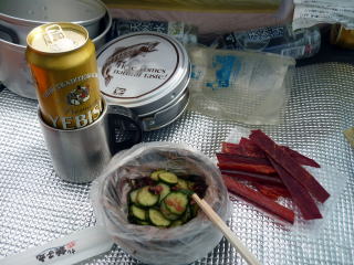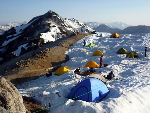 ここから更に斜度は増すが、雪が緩んでいるのでアイゼンは着けずダブルストックで行く。 因みに、居合わせた方々は、全員12本爪装着していた。 合戦沢ノ頭まで急坂を行く。ルートを示す赤旗竿があり、トレースもしっかりついている。 雪が腐り、トレースの足型が崩れてしまう所もあり、少し逸れ、キックステップで自分の足 跡を刻む。 12:10 合戦沢ノ頭通過。ここから暫く斜度が緩む。 ![]() 12:20 槍が見えた〜♪(^^) ↓燕山荘 ![]() 小屋は見えるが、なかなか着かない(^^; 小屋直下の急登を頑張り、燕山荘到着!!と思いきや、小屋前の夏道は雪で覆われ 行けず、小屋の裏手、冬期小屋をぐるっと回り、正面玄関に辿りついた(^^; 12:50 燕山荘着。(テン場代 1人¥500) ハイジが受付を済ませている間に、ちー隊長がテントを張る場所を決める。 遅い出発ながら、本日我らは3番乗り〜♪ テン場は雪に覆われており、トイレは小屋のを使用する。 ↓燕岳 ![]() ↑我が家♪ 13:40 テン場出発。空身で燕岳を往復する。 ![]() お約束のイルカ岩と槍ヶ岳♪ テン場〜燕岳間は雪はない。 14:05−15 燕岳(大休止) ↓鹿島槍 ↓餓鬼岳 ![]() 燕岳より望む ↓大天井岳 ↓槍ヶ岳 ![]() 燕岳より望む ↓燕山荘 ![]() 燕岳側から望む ![]() 穂先をお口に〜♪(^^) 14:35 テン場着。 14:45 燕山荘へ水を買いに行く。(ペットボトル 0.5L¥200、2L¥600) 期待していなかった生ビール(一番搾り¥800)が売っていたので、テントへ戻る前に 小屋内ベンチで早速.乾杯〜♪ ![]() 15:30 テントで乾杯♪