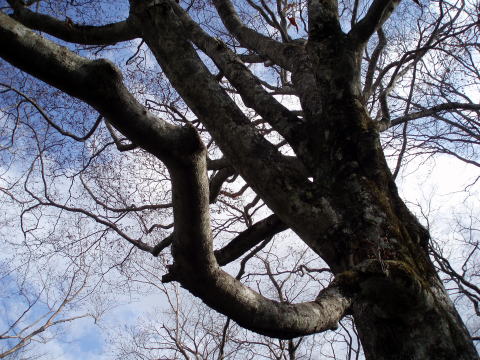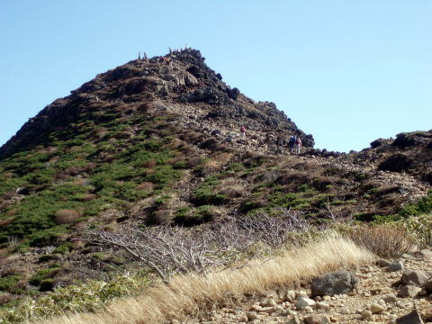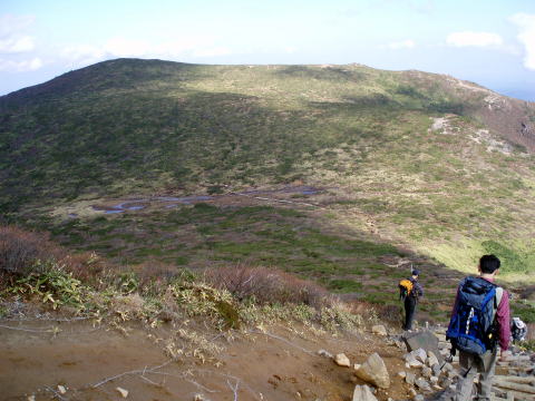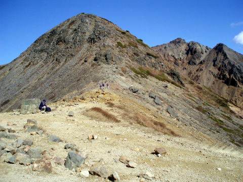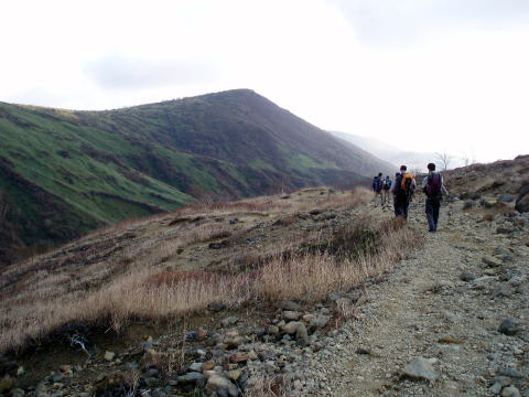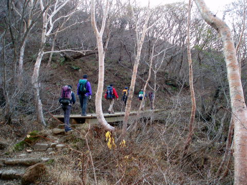 ロープウェイ山麓駅 9:55〜10:45 峰の茶屋 10:55〜11:20 朝日岳の肩 11:25 〜12:20 三本槍岳 12:40〜13:30 大峠 13:45〜15:00 三斗小屋温泉(泊) 大宮駅7:10発やまびこに乗り、8:08 那須塩原着。 8:30発のバスに乗る。時間的なものか、時期のためか、登山客は私達のみ。 9:45 ロープウェイ山麓駅着。身支度を整え、9:55 出発。 天気予報では、下界はお天気いまひとつの予報であったので、雨具着用の覚悟で 出かけてきたが、幸い山の方はイイ天気(^^)v ![]() 10:05 峠の茶屋通過。 広い駐車場は9割り方埋っている。 シンボルの鳥居をくぐり、登山道へ。 10分ほどで視界が開ける。 ↓剣が峰 ↓朝日岳 ![]() これから向かう朝日岳方面への稜線を望む 何度も通り何度も見ている景色だが嬉しい♪ ![]() 10:45 峰の茶屋着。(小休止) ↓流石山1813m ↓隠居倉1819m ![]() 峰の茶屋より望む 風の通り道である峰の茶屋付近であるが、今日は珍しく微風程度で穏やかだ(^^) ↓剣が峰1799m ↓朝日岳1896m ![]() 10:55 峰の茶屋出発。 本当に気持ちいい絶好の山歩き日和〜♪♪ 剣が峰を巻くようにつけられた道を行く。 左上側へ目をやれば、特徴ある岩岩のお出まし。 岩峰に窓がることを、ハイジは今回初めて気がついた!! ↓窓がわかるかなぁ〜(^^) ![]() ↓黒点はロープウェイ ![]() ↑右側は谷を挟み、峠の茶屋から歩いてきた道が見える。(上側水平道) にせ穂高の異名を持つ朝日岳への道は、鎖の付けられた片側切れ落ちた岩道を トラバースする所もある。 ↓朝日岳 11:20 朝日岳の肩着(小休止) ↓隠居倉1819m ↓流石山方面 ![]() 朝日岳の肩から望む ![]() 登山者で賑わう朝日岳山頂(1896m) K氏は隠居倉経由で三斗小屋温泉へ向かうということで、ここから別行動となる。 11:25 朝日岳の肩出発。 ここからは登山者もぐっと少なくなる。 11:40 熊見曽根通過。 昨年は吹雪の中この先まで進み引き返したんだよね〜と、ちー隊長と言い合いなが ら歩を進める。 やがて眼下に清水平の湿原が見えてきた。 急下りの階段状の道を行く。 ![]() 清水平の湿原を望む ![]() 清水平より望む三本槍岳(1917m) 11:55 北温泉分岐通過。 ちー隊長から聞いてはいたが、ここから三本槍岳へ登り返すまでの道は、深く掘れ た狭い悪路を行く。 ↓三本槍岳 ![]() 12:20 三本槍岳山頂着。(大休止) 雲が大分でてきた。風向きも変わり冷たい。 適当な所に腰を下ろし持参のパンで昼食。 ![]() 三本槍岳山頂 ↓(手前ピーク)流石山1813m ![]() ↑画像中央・下側隠れた部分が大峠 ↓旭岳 ![]() 手前尾根が大峠への道 12:40 三本槍岳山頂出発。 三本槍岳からは、まばらな登山者もいなくなり、私達だけの道となった。 緩やかな道を行く。 12:50 甲子温泉分岐通過。 ↓旭岳(1835m) ![]() 鏡ヶ沼を望む 谷を挟んで左側に隠居倉コースの尾根を望む。今頃K氏はもう隠居倉を後にしてし まったかなぁ〜などと思いながら歩く。 隠居倉コースの尾根の向うには、噴煙をあげる茶臼岳や、昨年歩いた沼原湿原も 見える。 ↓流石山 ↓大峠山 ![]() ↑大峠を望む 緩やかだった笹原の道が、眼下の大峠へ向けてザレた急下りの道へ変わる。 13:30 大峠着。 いい調子で歩を進めてきたので、長めに休憩。 諸事情で山歩きは1年ぶりというM氏とW氏だが、とっても健脚であ〜る(^^)。 13:45 大峠出発。 涸れ沢状の登山道を行く。 道の両側は、笹とブナ林の組合せで、いかにも熊出没注意であ〜る(^^; 三斗小屋温泉までは、飛び石伝いに沢を3つほど越える箇所がある。 ![]() ![]() 2つ目の沢(中ノ沢) 3つ目の沢に下りる手前に、2mほどの鎖場があった。 ハイジは短足なので、足の置き場に難儀し、しっかりと鎖を利用する(^^; 14:30 3つ目の沢(赤岩沢)通過。 どの沢も飛び石伝いであるが、その箇所だけはちー隊長が先行し、ハイジを誘導し 手を差し出してくれる(#^^#) 一人歩きならば当然一人で対処するし、してきたので、今だって一人で大丈夫だよ ・・・と内心思うが、さりげない心遣いが嬉しくて、しっかり手を握ってしまった(#^^#) 沢を渡ると、三斗小屋温泉へ向けて最後の登り返し。 下りに慣れてしまった足には、最後の登り返しは足が重い(^^; すっかり葉を落としたブナ林の道を行く。 15:00 三斗小屋温泉・大黒屋着(泊) 本館と離れ(新館?)の建物がある。 離れの建物の窓から、別隊で一足先に着いていたS氏達が笑顔で迎えてくれた。 離れは本館に比べて、建物が新しかった。 日曜日泊だったためもあり、私達8名のために3部屋が用意されていた。 荷を解き、早速本館の温泉へ。 浴室は二つあり、時間帯により男女交代で利用する。(石鹸類使用禁止) 入湯後、外水道で冷やしておいたエビスを回収する(^^)v 先着隊は先に入湯を済ませ盛り上がっていたので、我らも大急ぎで追いかける♪ 角部屋を宴会部屋と定め、他部屋からテーブルを持ち込み宴の準備を整える(^^) 16:00 宴の始まり〜♪ テーブルの上には皆で持ち寄った豪華メニューの勢揃い(^^)v O氏持参の自家製お漬物2種類、小ぶりの茹でジャガイモ、我が母特製小松菜キムチ、 セロリとにんじんのきんぴら、乾き物多種類。 