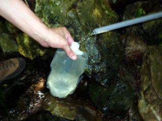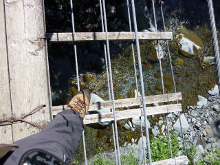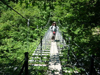 9:00 椹島出発。 5分ほどでアスファルトの道となる。 ![]() 9:15 滝見橋を右手に見送り登山道へ。 ちー隊長22kg&ハイジ14kg。重荷で二人ともすでに汗びっしょり(^^; 登山道に入ってすぐ、滝の脇を通る。 ちー隊長は、気持ちいい〜♪と言って、顔を洗ったついでに頭から滝の飛沫を浴びる(^^) ![]() 吊り橋を渡り、緩やかな樹林帯の道を行く。