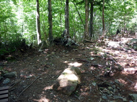 樹林帯では陽は遮られるものの、蒸し暑さを想像していたが、思っていたほど不快ではない。 虫対策も万全にしてきたが、意外なことに刺す虫もいない。 間もなく傾斜もきつくなったが、良く整備され踏まれた道は歩きやすい。 小屋泊の人達にどんどん抜かれたが、一歩一歩マイペースで行く。 10:10−20 鉄塔横(小休止・オレンジジュース・一口大福) 小広場は、皆の休憩ポイントだ。登下山者で賑わっている。 10:55 林道横断。 11:20−30 小石下(小休止・おにぎり) ![]() ベンチがある小石下 11:55 林道横断。 歩きだしてから3時間を過ぎたあたりで、ハイジは眠気に襲われる(^^; 体調が悪いわけではないのだが、今までにも数度この状態になったことがあり、そうなると 亀足は更に遅くなる(^^;; 頭がぽーっとして、足元はフラフラなのだ。 もうすぐ休憩ポイント・水場のはずなので、そこまで頑張る。 12:45−13:00 清水平(水場) 大休止。ゆっくり腰を下ろし休憩。