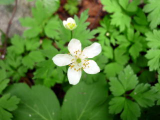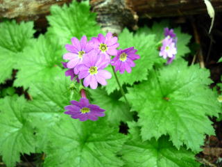 13:40 蕨段通過。 眠気は去り、汗も出し切って?、体もスッキリしてきた。 この辺りから、抜かれていた小屋泊の人達に追いつき、追い越すようにもなってきた。 13:55−14:05 見晴台(小休止・おにぎり) 見晴台は、登山道から一段上がった小広場だ。 ↓地図には荒川三山&赤石岳の展望所とあるが、山頂が隠れ、どの山か不明(; ;) ![]() 遠くで雷鳴が聞こえ雨がパラついてきた。再び樹林帯に入ることだし、雨具は着ずに行く。 歩きだすと、にわか雨はすぐ止みラッキー♪ 15:05−15 駒鳥池(小休止・オレンジジュース・一口大福) 池は登山道から少し入った所にあるが、二人とも以前寄ったことがあるのでパス。 手前から樹間越しに見たところ、大きな水たまりだった(^^; 右手にニリンソウやオオサクラソウの群落が現れると、千枚小屋はもうすぐだ♪