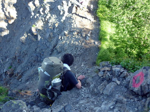核心部は、短いながらも段差が大きく急降下だ。荷が重いので絶対にバランスを崩すこと